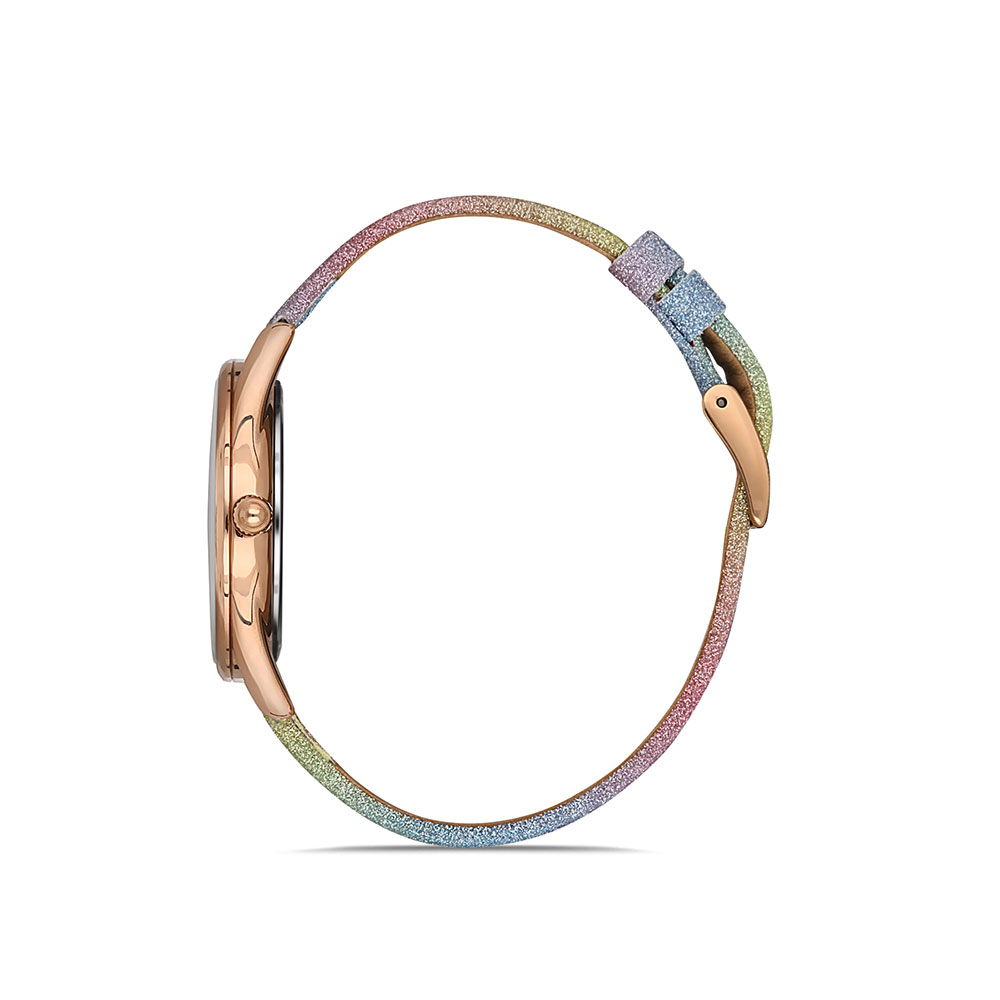 Cureaua din piele, cu acelasi efect sclipitor si tonuri gradient, asigura confort si stil, fiind usor de asortat atat cu tinute casual, cat si cu cele elegante. Sistemul de inchidere cu catarama garanteaza o fixare sigura pe incheietura.