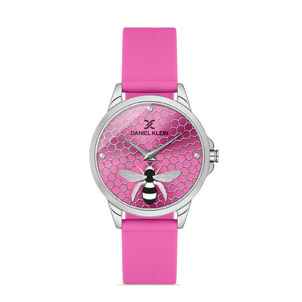 Cadranul rotund de 35 mm impresioneaza printr-un fundal fucsia decorat in relief cu un model inspirat de un fagure de miere, avand ca element central o albina detaliata. Aceasta combinatie ofera un efect vizual deosebit, potrivit pentru femeile care doresc sa iasa in evidenta.