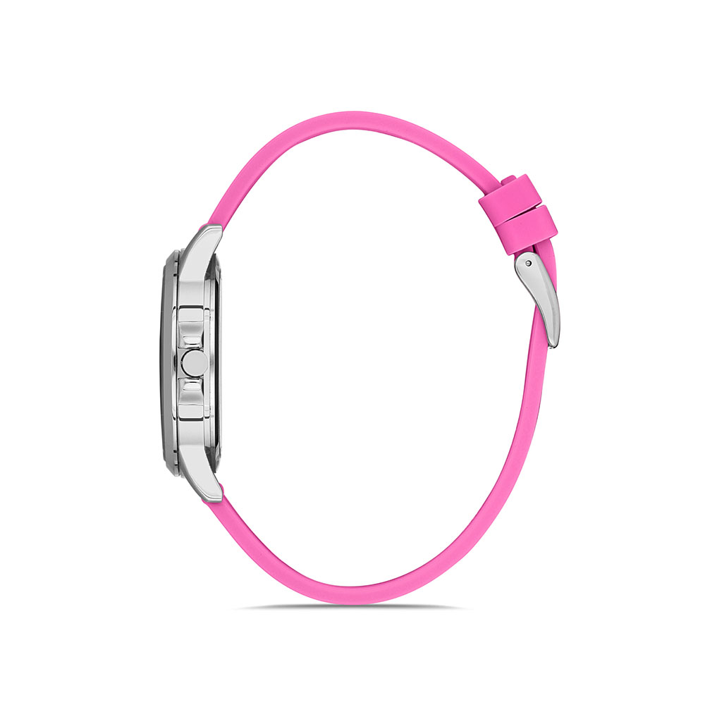 Carcasa argintie din aliaj metalic adauga un plus de rafinament, iar geamul din cristal mineral protejeaza impotriva zgarieturilor. Cureaua din silicon fucsia asigura confort maxim pe parcursul intregii zile, fiind ideala pentru purtare zilnica.