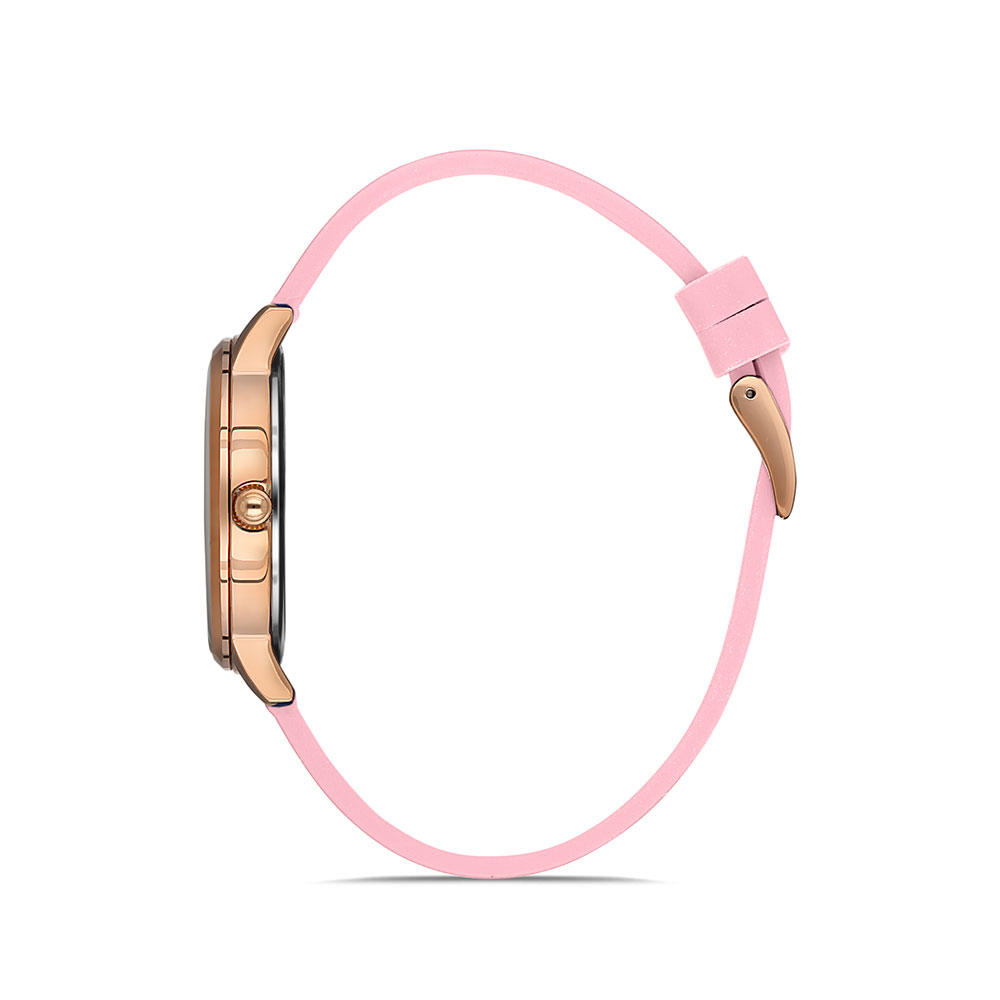 Cureaua din silicon roz asigura un confort deosebit la purtare, fiind atat placuta la atingere, cat si rezistenta in timp. Sistemul de inchidere cu catarama garanteaza o fixare sigura pe incheietura, oferindu-ti libertatea de miscare pe parcursul intregii zile.