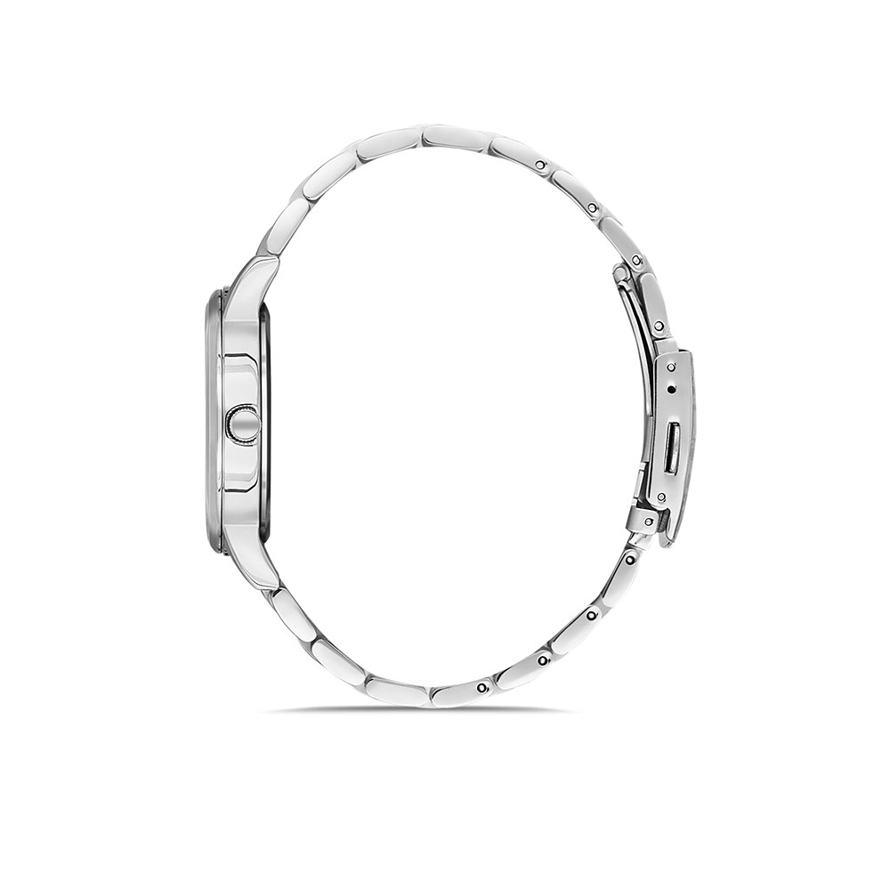 Cadran decorat cu motiv floral si zirconii albe; bratara tip zale, cu inchizatoare tip fluture; fara indicator secunde.
