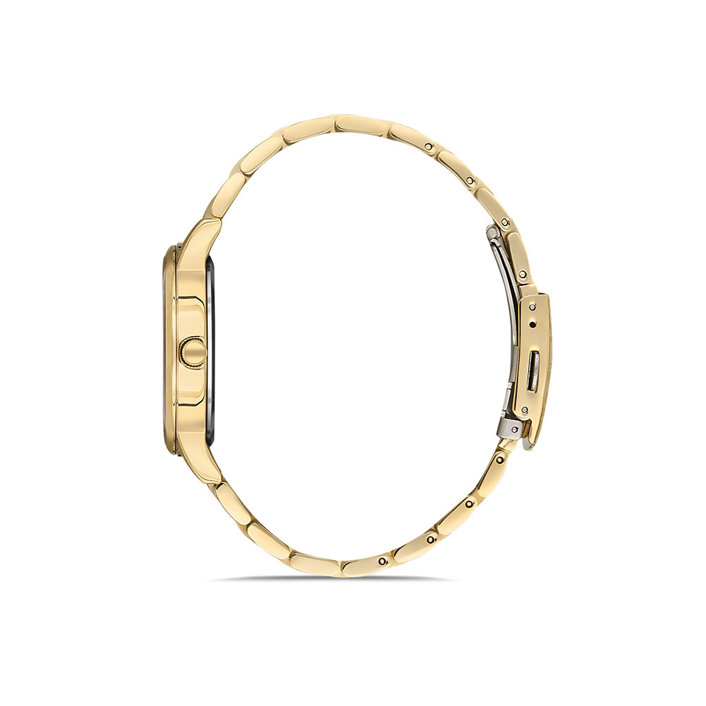 Cadran decorat cu motiv floral si zirconii albe; bratara tip zale, cu inchizatoare tip fluture; fara indicator secunde.