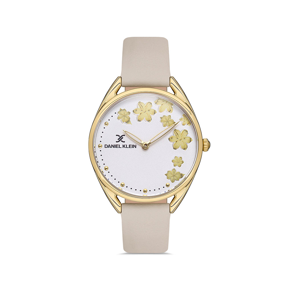 Cadranul alb-argintiu este decorat cu motive florale aurii, adaugand un plus de rafinament si originalitate. Carcasa rotunda, cu un diametru de 34 mm, este realizata din aliaj metalic auriu, asigurand durabilitate si un aspect luxos.