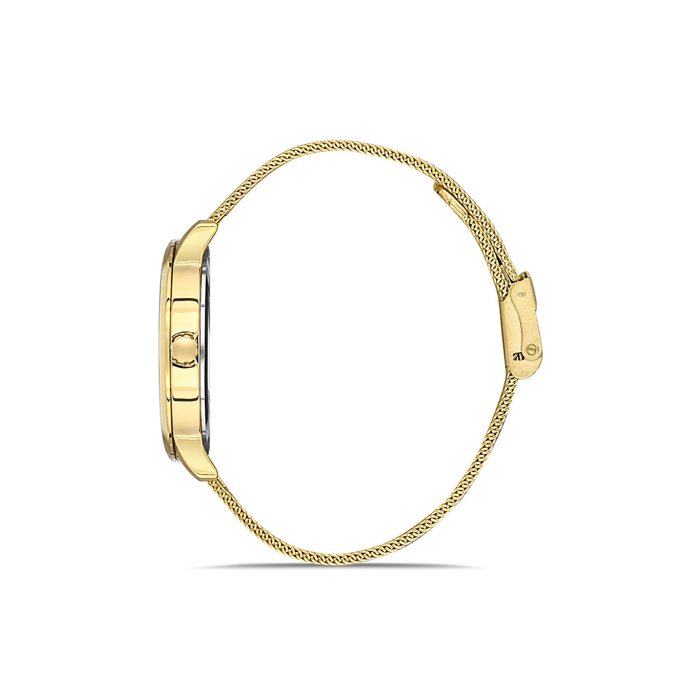 Carcasa rotunda de 36 mm este realizata din aliaj metalic si are un finisaj auriu, conferind un plus de eleganta. Bratara din aliaj metalic auriu cu inchidere reglabila se adapteaza perfect incheieturii, oferind confort pe tot parcursul zilei.