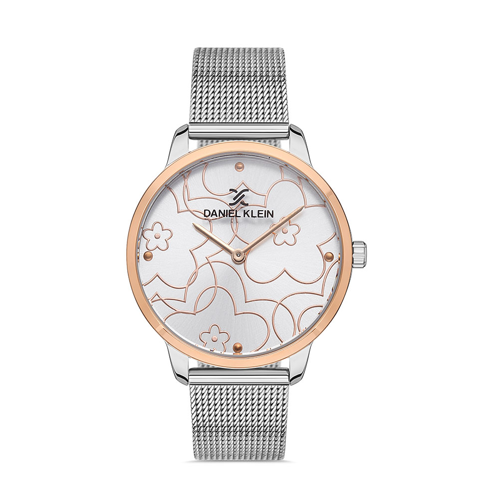 Cadranul argintiu decorat cu motive florale in tonuri aurii rose adauga un aer feminin si delicat, completat de indicatoarele subtiri si sigla brandului pozitionata elegant. Conturul carcasei in nuante de auriu rose evidentiaza designul modern, oferind un contrast subtil, dar de efect.