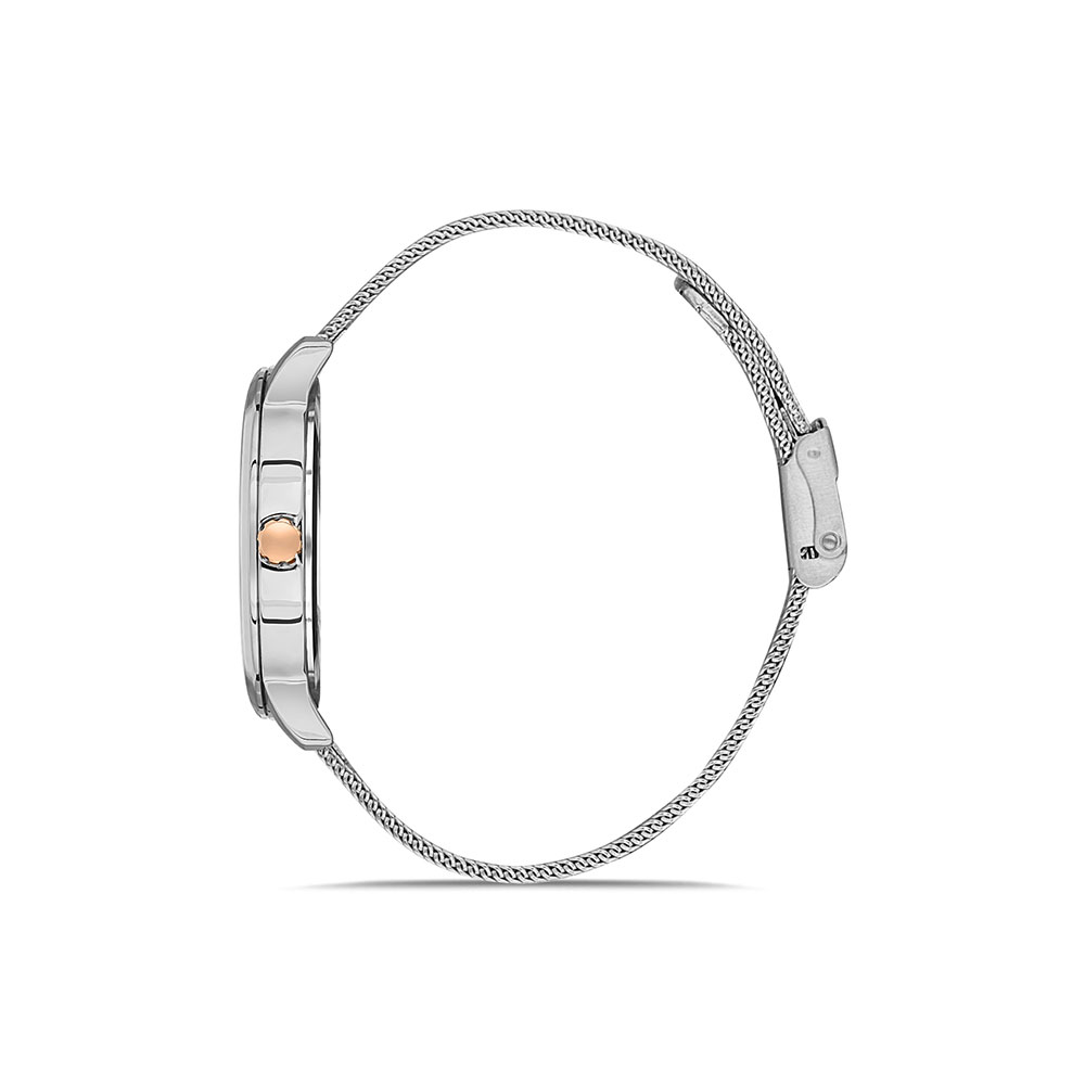 Cadranul argintiu este decorat cu un model floral subtil, conturat in nuante aurii rose, oferindu-i un aspect feminin si sofisticat. Indicatoarele fine si marcajele discrete completeaza armonios estetica acestui ceas fashion.