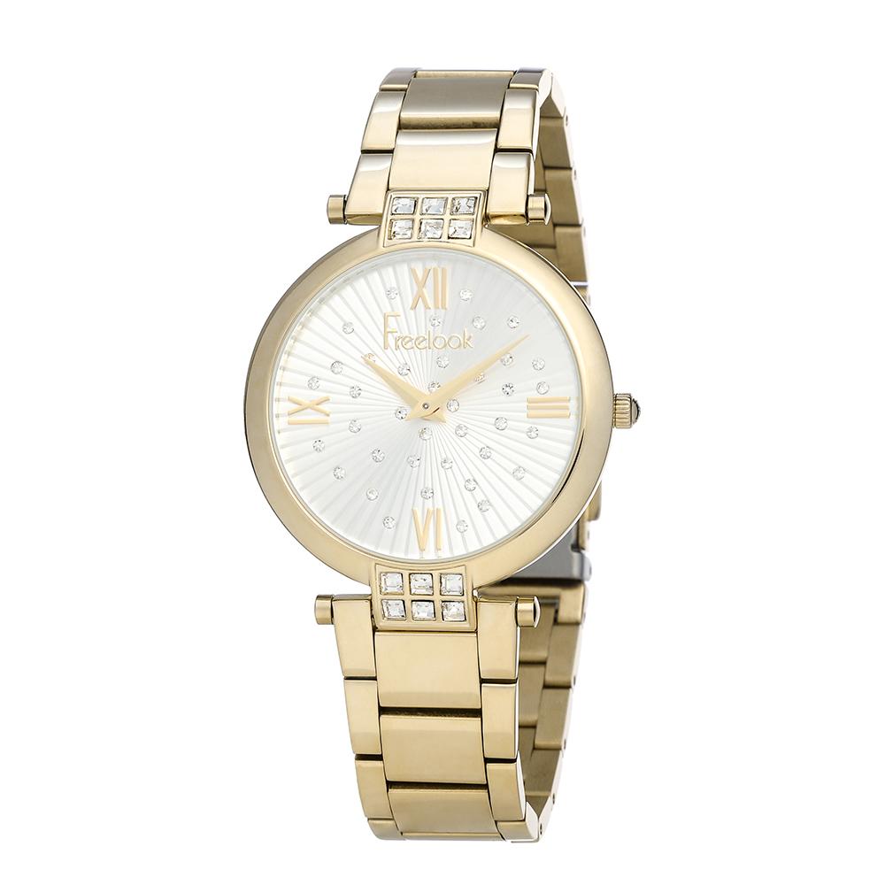 Carcasa decorata cu zirconii albe; bratara tip zale, cu inchizatoare tip fluture; fara indicator secunde.