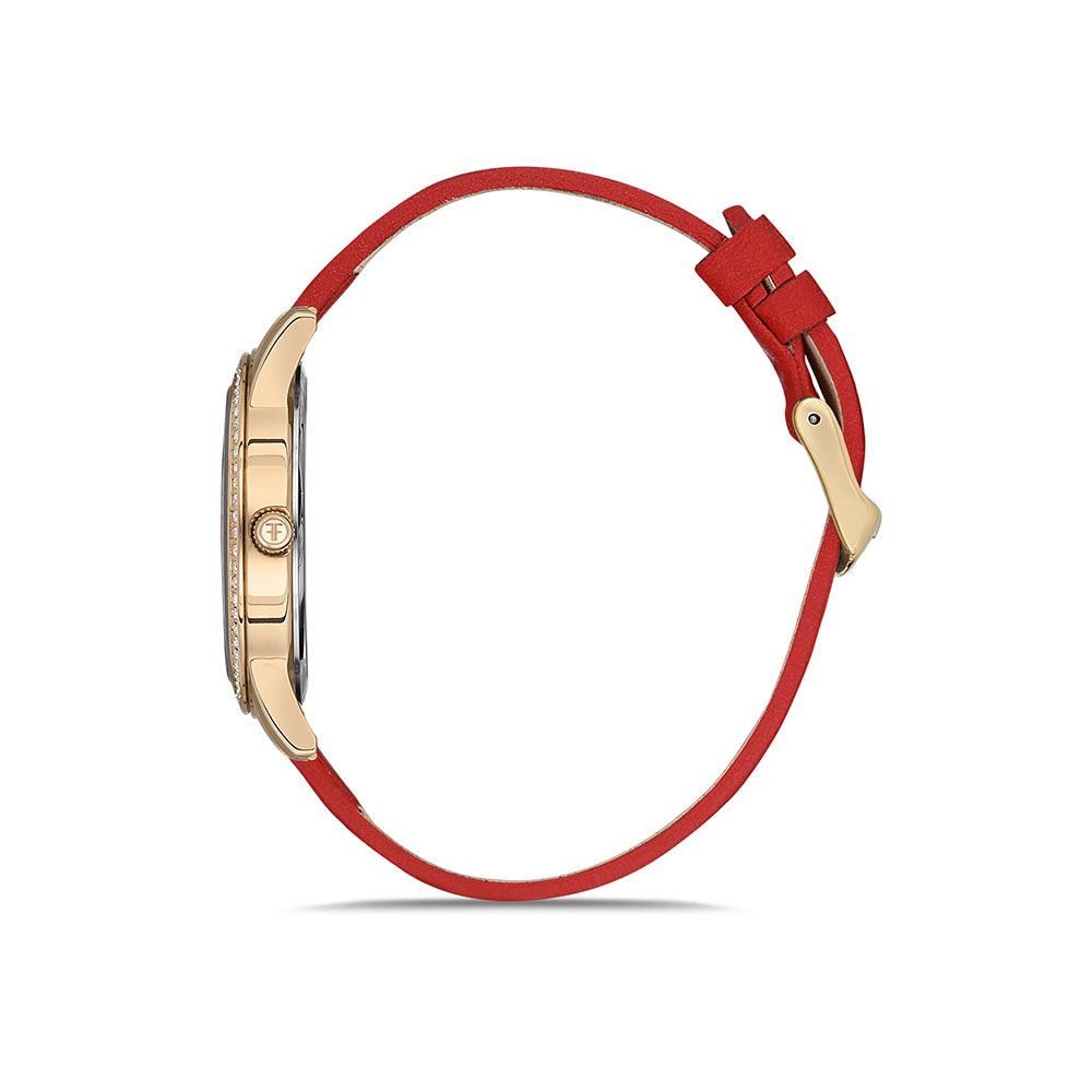 Curea de piele rosie, finisata cu o catarama eleganta, adauga un contrast vibrant si este confortabila pe tot parcursul zilei. Rezistenta la apa de pana la 5 atm il face potrivit pentru utilizare zilnica, fiind rezistent la ploaie si stropi accidentali.