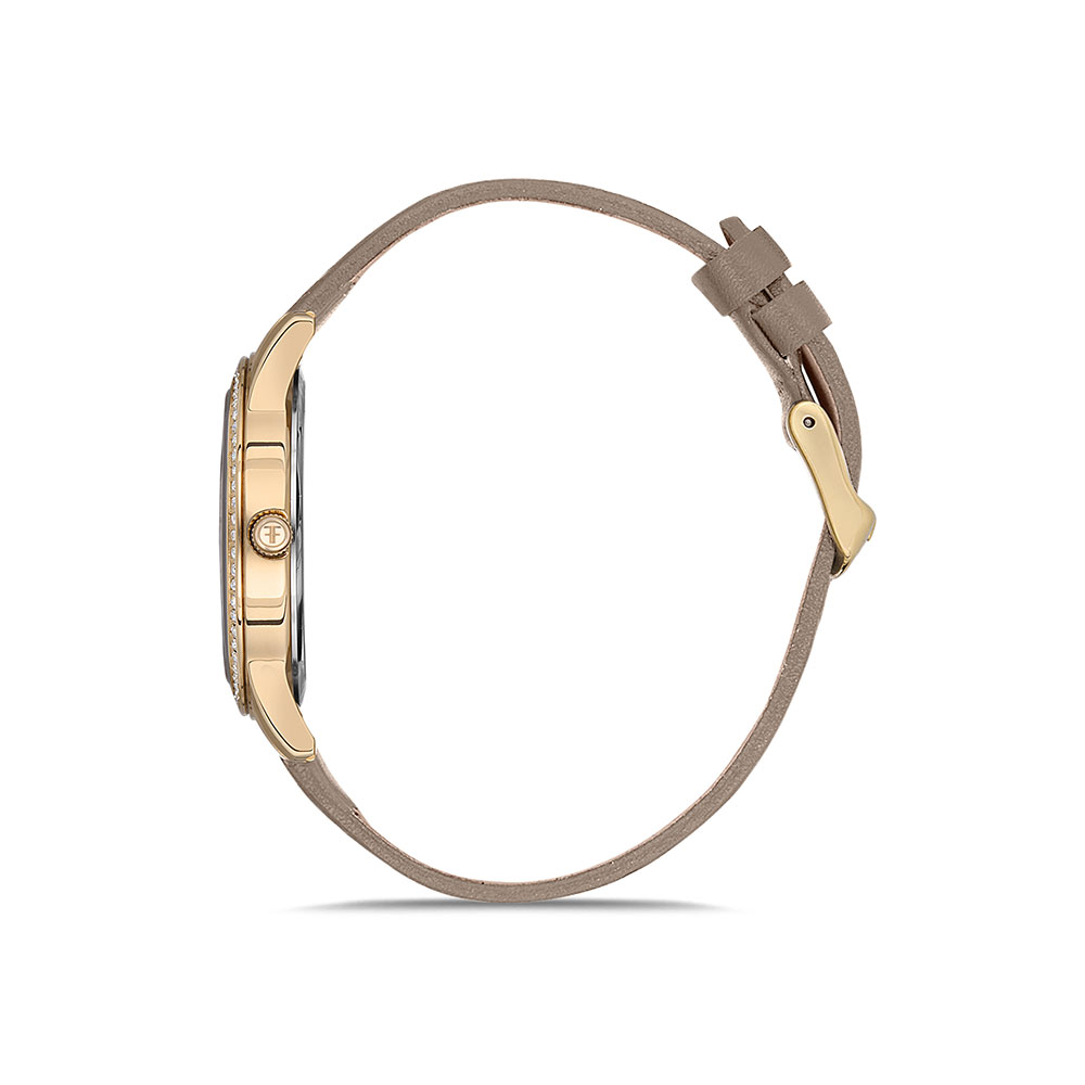 Avand un mecanism quartz japonez de inalta precizie cu o abatere de doar ±20 secunde pe luna, acest ceas este conceput pentru a oferi nu doar acuratete, ci si durabilitate. Carcasa rotunda, aurie si incrustata cu cristale stralucitoare, se completeaza armonios cu bratara din piele de culoare grej, oferind un contrast sofisticat si modern.