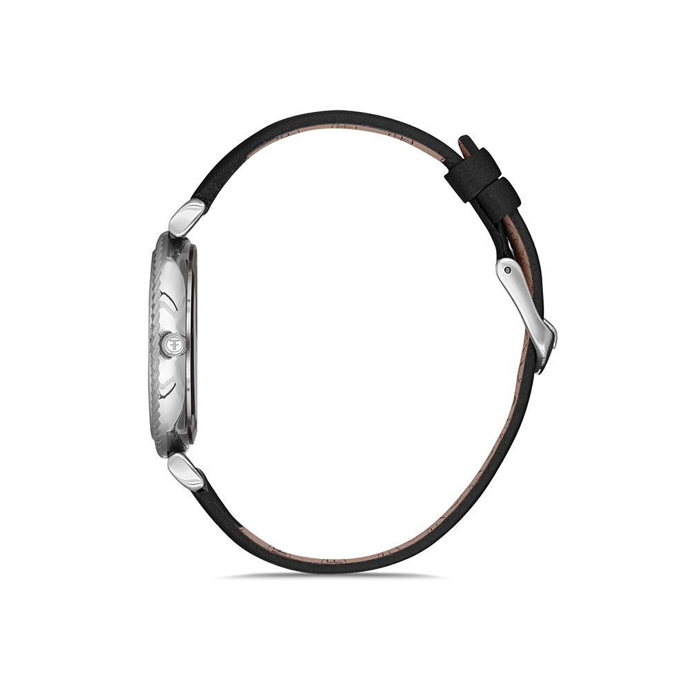 Cureaua din piele neagra, accesorizata cu o catarama simpla, garanteaza confort si durabilitate, iar rezistenta la apa de pana la 5 atm face ceasul potrivit pentru uz zilnic, indiferent de vreme. Geamul din cristal mineral protejeaza ceasul impotriva zgarieturilor si impacturilor usoare.