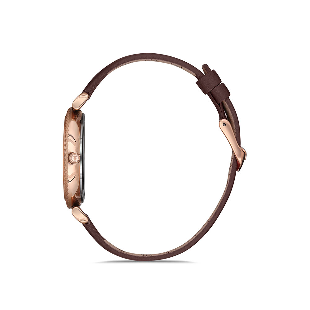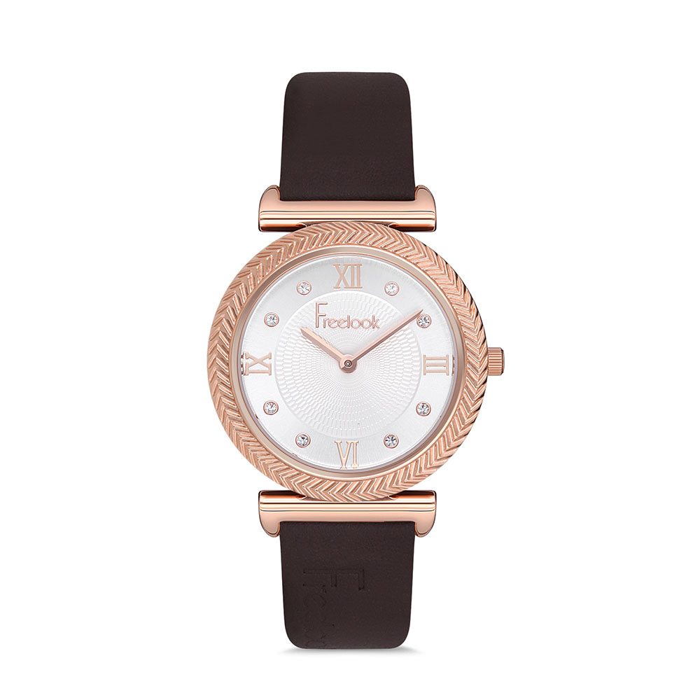 Ceas de dama Freelook cu un design la moda, potrivit pentru tinutele de zi cu zi. Bezelul este decorat cu un model de spic de grau in relief, cadranul este incrustat cu zirconii albe iar indicatorul pentru secunde lipseste. Cureaua este din piele naturala, avand numele brandului inscriptionat in partea inferioara.