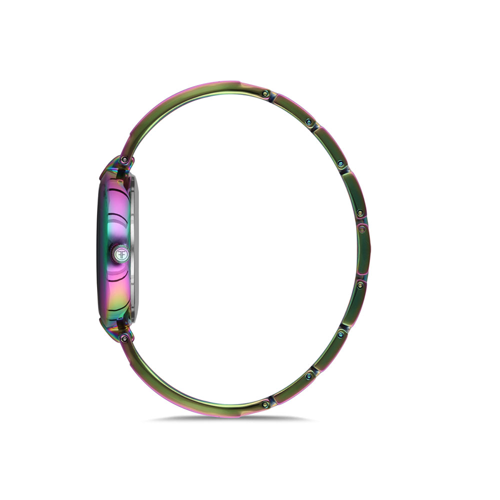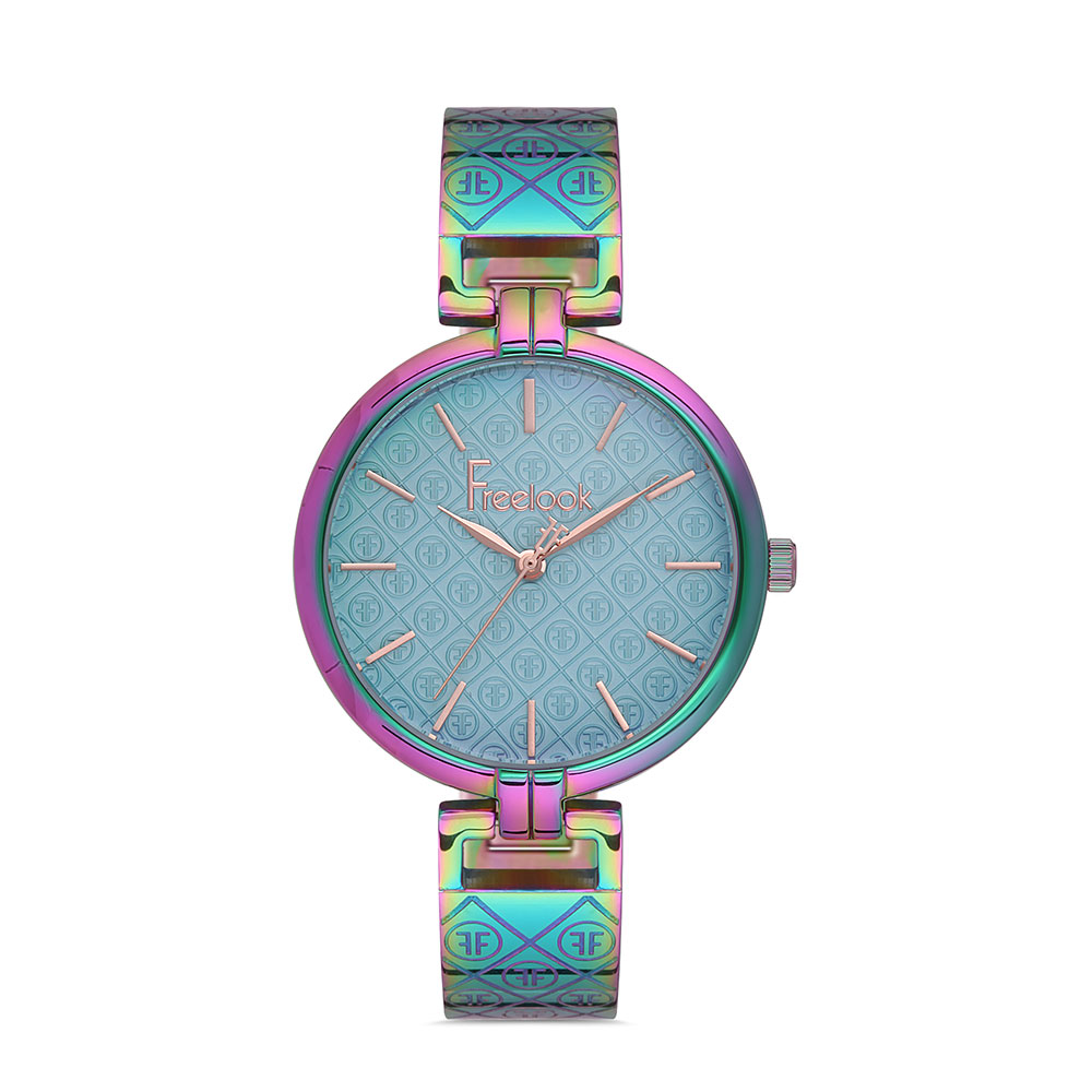 Ceas de dama Freelook potrivit pentru cele care isi doresc sa fie in pas cu moda si indraznesc sa iasa in evidenta. Atat carcasa cat si bratara sunt finisate multicromat, afisand un curcubeu de culori. Cadranul prezinta un model de romburi in relief, care contin in centrul lor monograma brandului. Modelul se continua si pe bratara semifixa a ceasului, pe sectiunea sa rigida. Sistemul de inchidere este de tip bijuterie.
