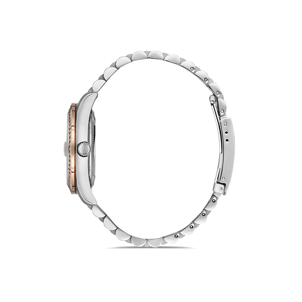 Cadran decorat cu zirconii albe; carcasa argintie cu bezel decorativ auriu si zirconii albe; bratara tip zale, in doua culori, argintiu si auriu, cu inchizatoare tip fluture, avand lungimea utila de 18 cm; afiseaza data curenta.