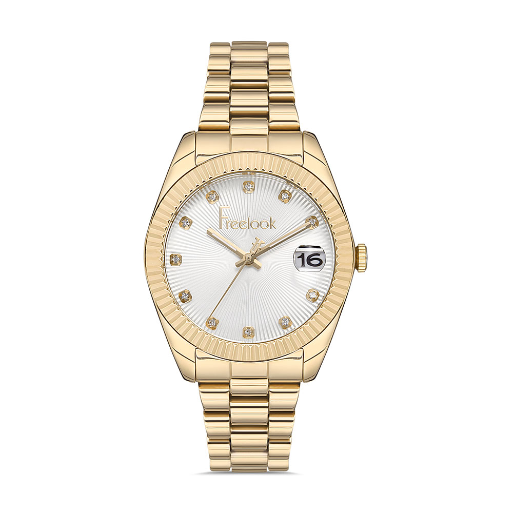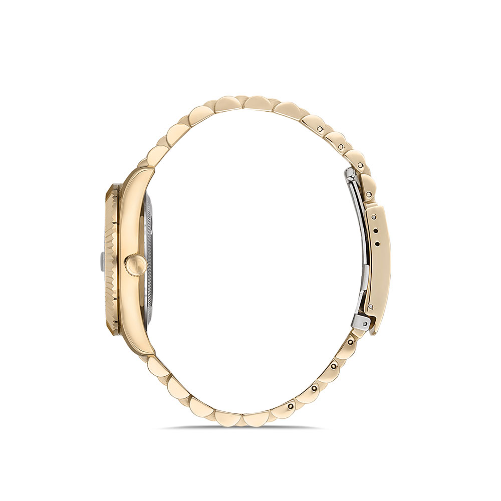 Designul atragator cu carcasa rotunda din aliaj metalic auriu si bratara din otel inoxidabil auriu adauga o nota de lux si durabilitate. Geamul din cristal mineral protejeaza cadranul alb argintiu, accentuat de indicii cu cristale, conferind un aspect luminos si elegant.