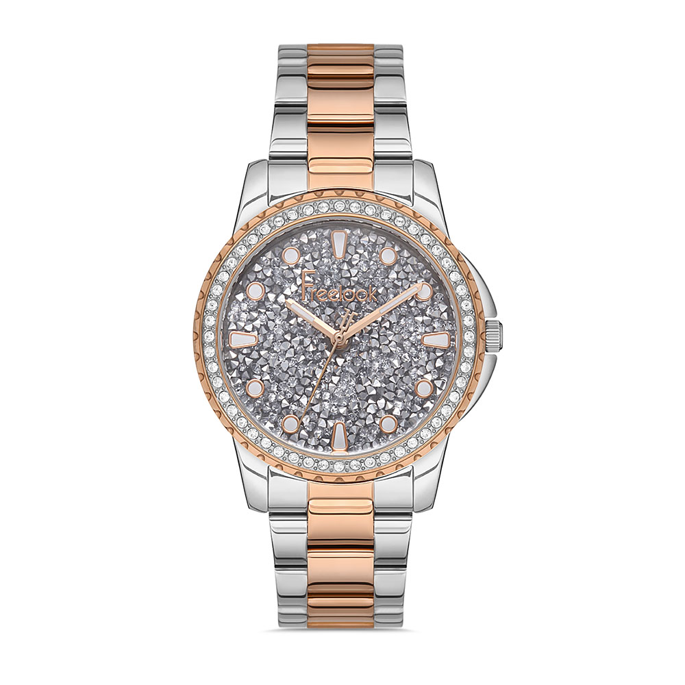 Aspectul sau este definit de un cadran gri, incadrat de o carcasa rotunda din alama argintie, accentuata de cristale minerale stralucitoare. Bratara din otel inoxidabil bicolor si sistemul de inchidere tip fluture completeaza designul elegant si faciliteaza o purtare confortabila pe tot parcursul zilei.