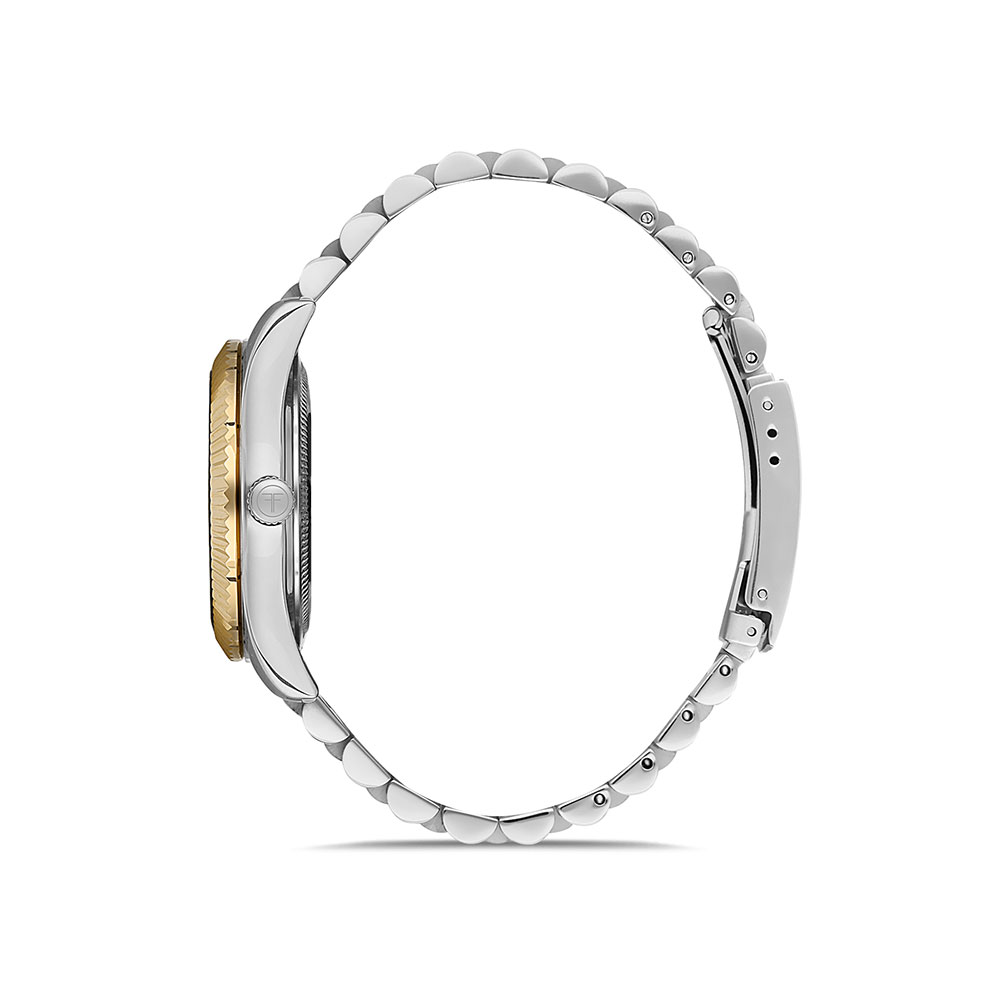 Ceasul este echipat cu un mecanism quartz japonez de inalta precizie, garantand o abatere de doar ±20 secunde pe luna. Cadranul alb argintiu, protejat de un cristal mineral durabil, este completat de o carcasa rotunda din alama si o bratara din otel inoxidabil bicolor, ce ofera un contrast vizual impresionant si o rezistenta marita la apa, de pana la 5 atm.