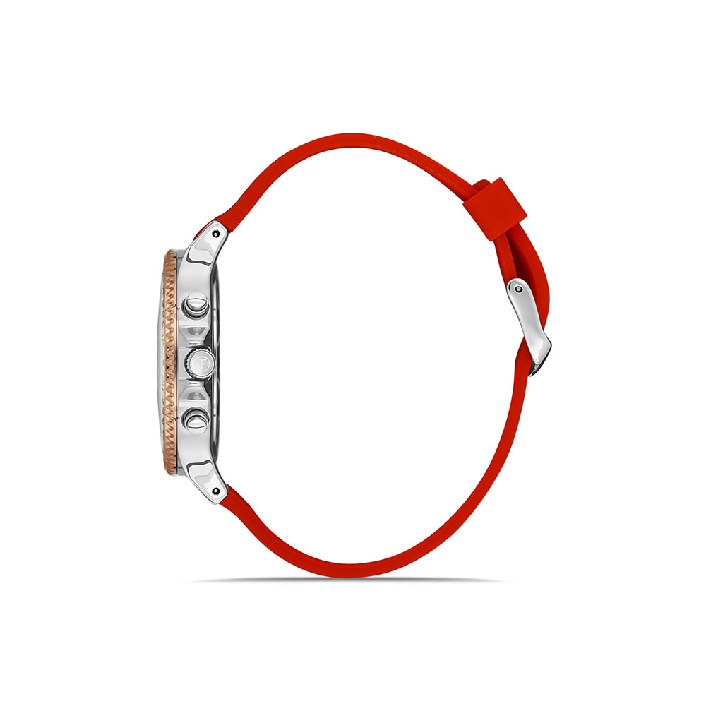 Designul ceasului este completat de o carcasa rotunda, eleganta, din alama cu finisaj argintiu si incrustatii care reflecta lumina, creand un efect vizual captivant. Cureaua de silicon rosu este nu doar un statement de stil, ci si un garant al confortului pe durata purtarii, fiind complementata de o catarama robusta care asigura o fixare sigura.
