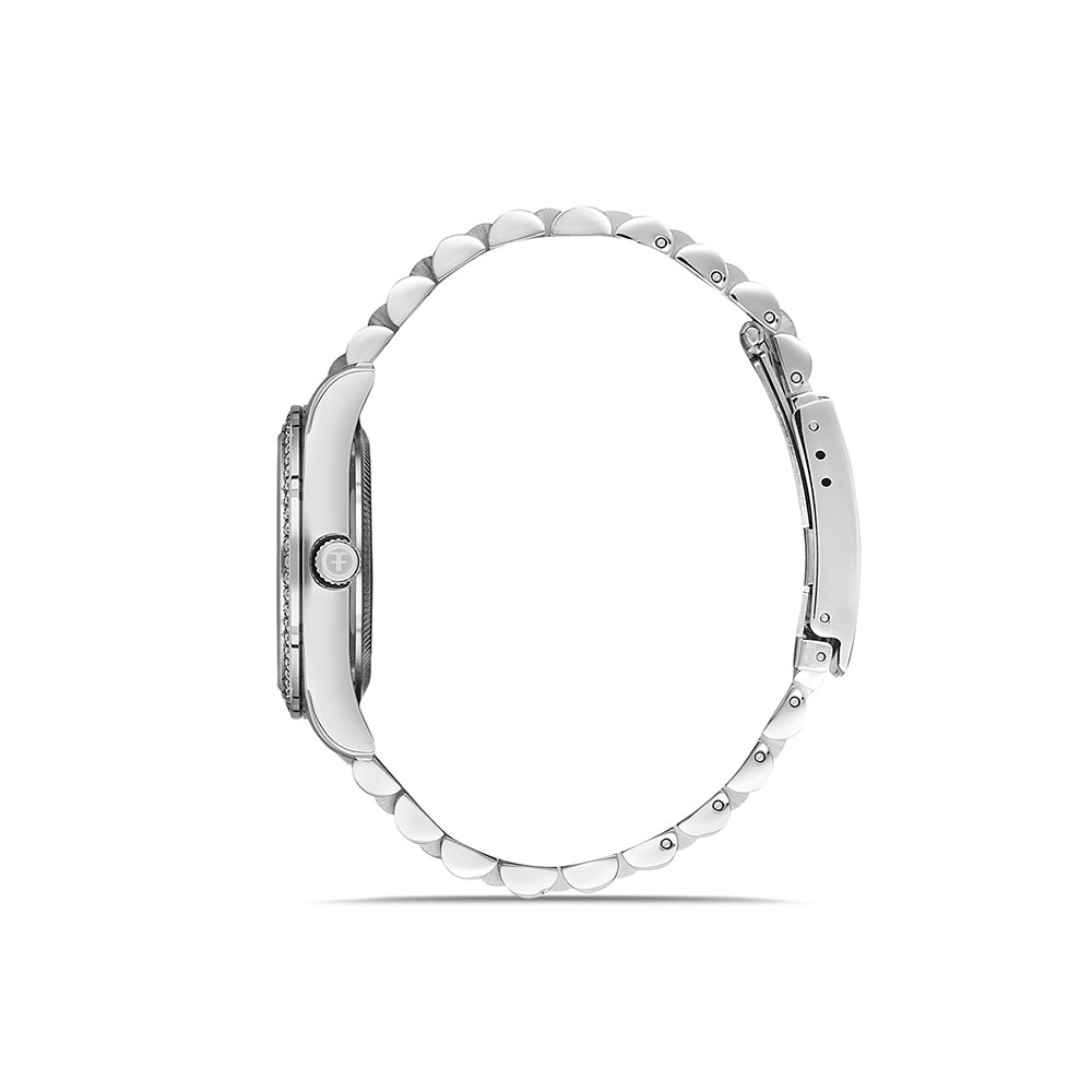 Acest ceas de mana pe bratara din otel inoxidabil argintiu este definit prin un mecanism quartz japonez de inalta precizie, cu o abatere de ±20 secunde pe luna, asigurand acuratete si durabilitate. Cadranul argintiu, incadrat de cristal mineral rezistent, este completat de detalii functionale cum ar fi afisarea datei, zilei saptamanii si ora in format 12/24.