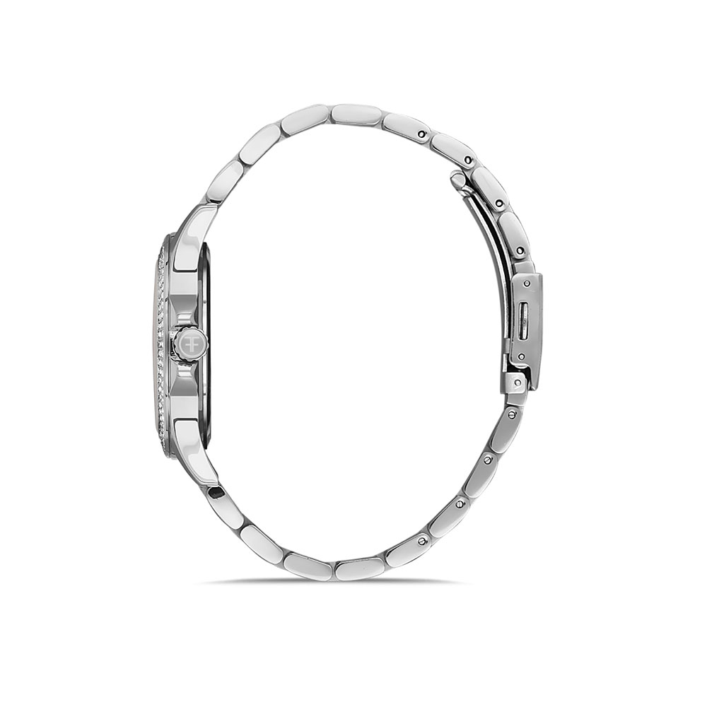Dotat cu un mecanism quartz japonez de inalta precizie, ceasul promite o abatere minima de ±20 secunde pe luna, asigurandu-va ca sunteti intotdeauna punctuali. Afisajul analogic este completat de un cadran argintiu elegant, incadrat de o carcasa rotunda din alama, accentuata de cristale stralucitoare care adauga un strop de lux.