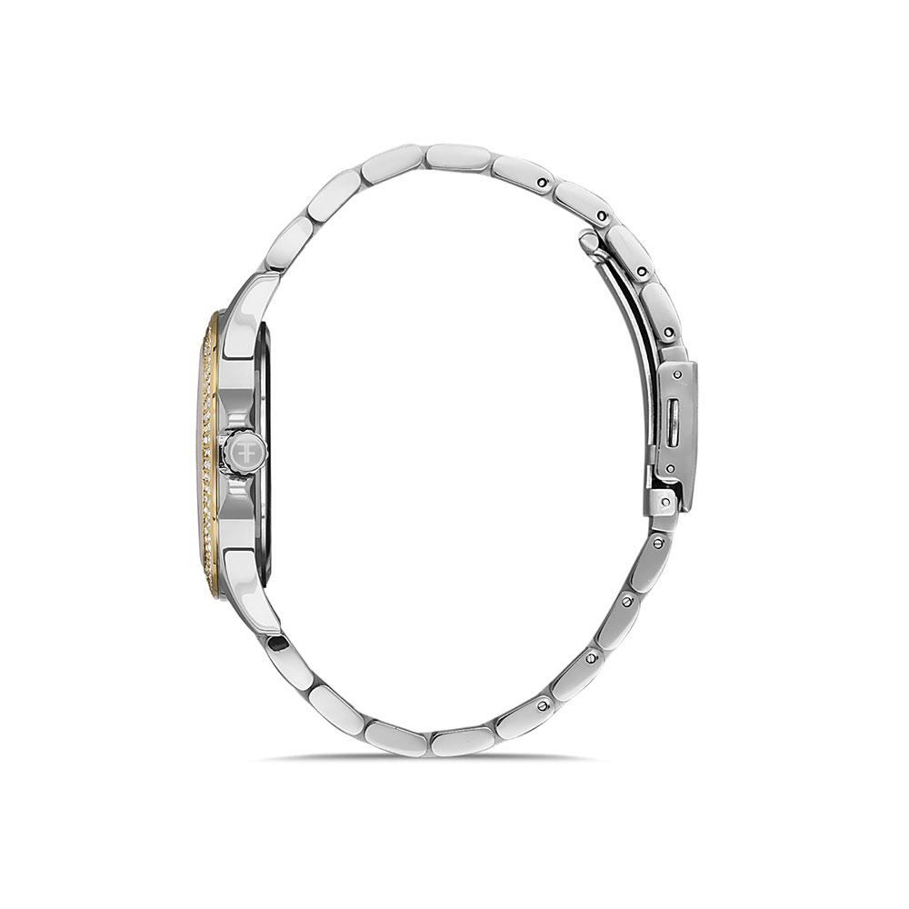 Fabricat cu un mecanism quartz japonez de inalta precizie, ceasul promite o abatere minima de timp, fiind un companion de incredere pentru gestionarea timpului dumneavoastra. Cadranul argintiu, impreuna cu carcasa rotunda din alama si bratara din otel inoxidabil auriu, adauga un plus de stralucire oricarei tinute.