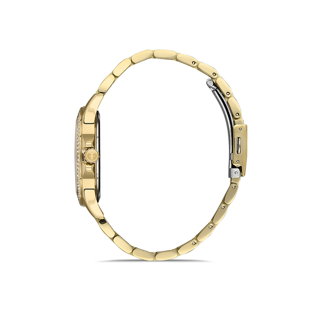 Carcasa rotunda de 37 mm din alama aurie, impodobita cu cristale stralucitoare, incadreaza un cadran argintiu elegant care gazduieste trei subcadranuri functionale si afisaje pentru ziua saptamanii si data. Bratara din otel inoxidabil in culoarea aurului adauga un touch de rafinament, in timp ce sistemul de inchidere tip fluture asigura o fixare sigura si confortabila.