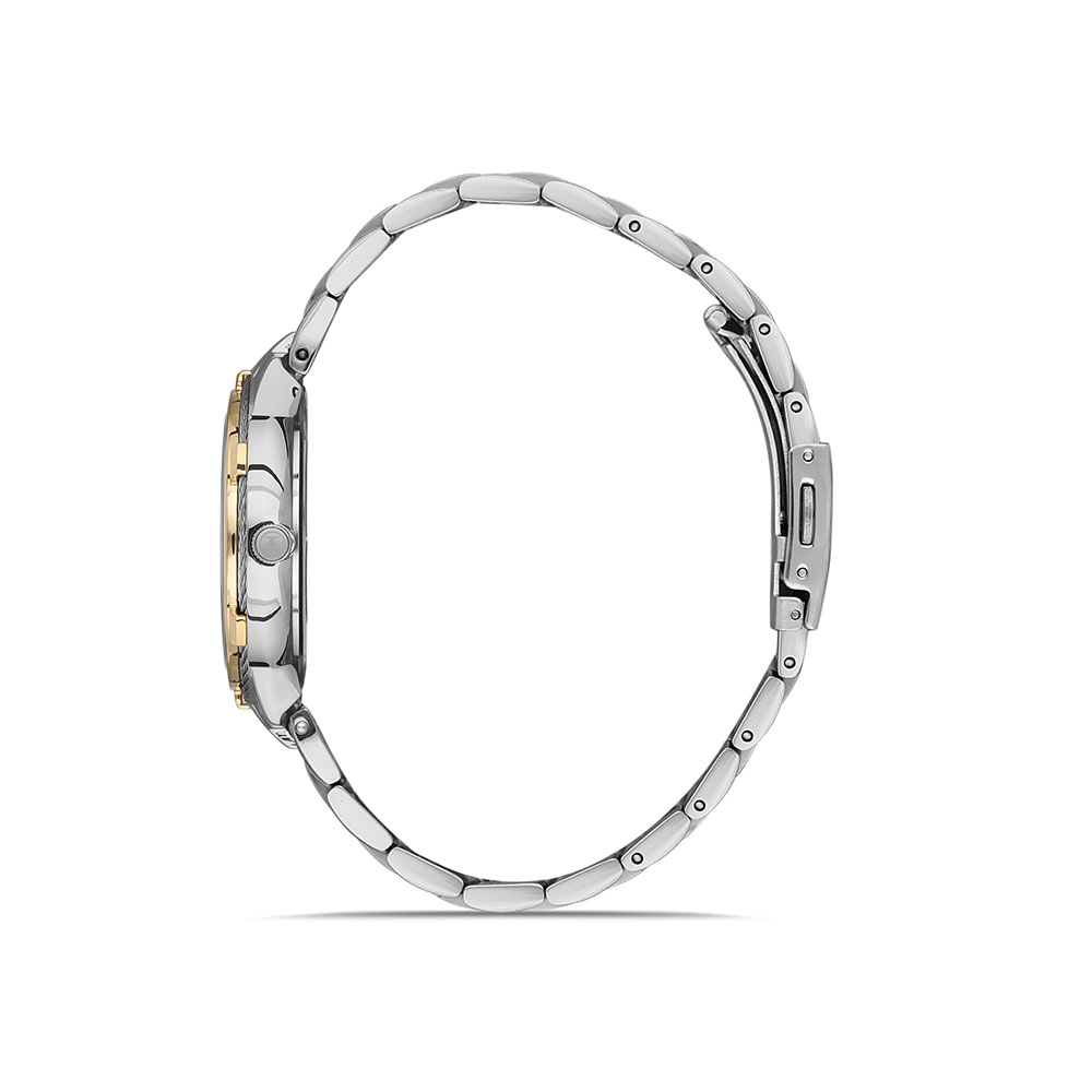 Acest model impresioneaza prin mecanismul Quartz de provenienta japoneza, recunoscut pentru acuratetea sa, avand o abatere de doar ±20 secunde pe luna. Cadranul analogic negru, accentuat de detalii argintii si aurii, este protejat de un cristal mineral rezistent la zgarieturi. Carcasa din alama si bratara din otel inoxidabil, in nuante de argintiu si auriu, ofera durabilitate si confort, fiind completate de un sistem de inchidere tip fluture pentru securitate maxima.
