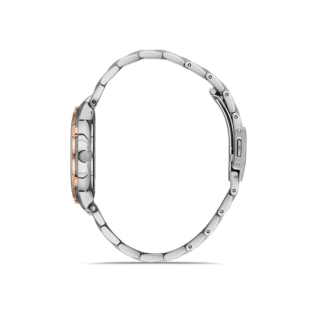 Colectia Belle se distinge prin designul sau sofisticat si detalii meticulos finisate. Carcasa rotunda de 35 mm, realizata din alama de inalta calitate, impreuna cu bratara din otel inoxidabil argintiu, subliniaza un look clasic, imbogatit cu o nota contemporana. Cadranul argintiu este decorat cu cristale scintilante, care reflecta fiecare raza de lumina, captand atentia si subliniind frumusetea oricarei tinute.