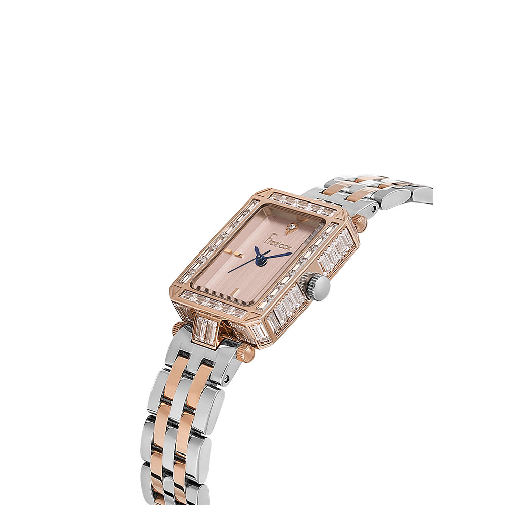 Dotat cu un mecanism Quartz Miyota 2035, cunoscut pentru abaterea minima de ± 20 secunde pe luna, acest ceas nu doar ca arata spectaculos, dar este si extrem de precis. Afisajul analogic, protejat de un cristal mineral rezistent, accentueaza cadranul argintiu, in timp ce carcasa dreptunghiulara din otel inoxidabil, finisata in nuante de auriu rose, confera un plus de stil si durabilitate.