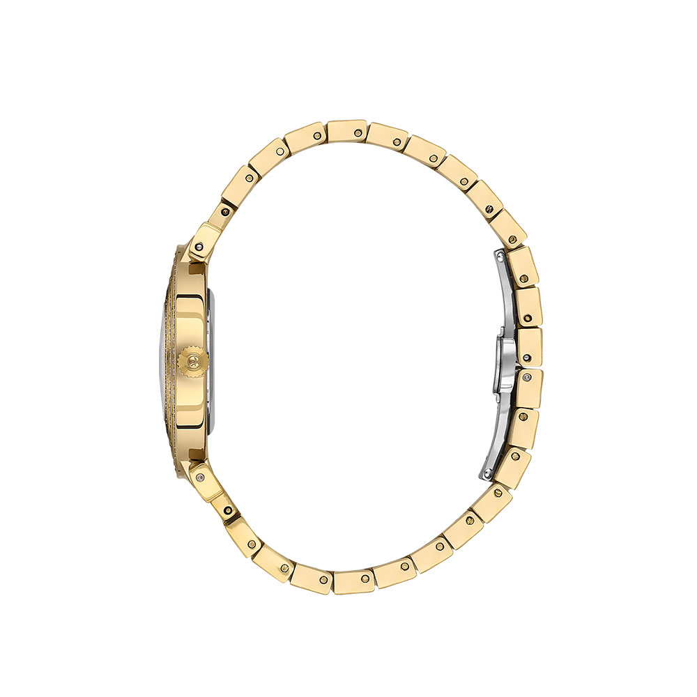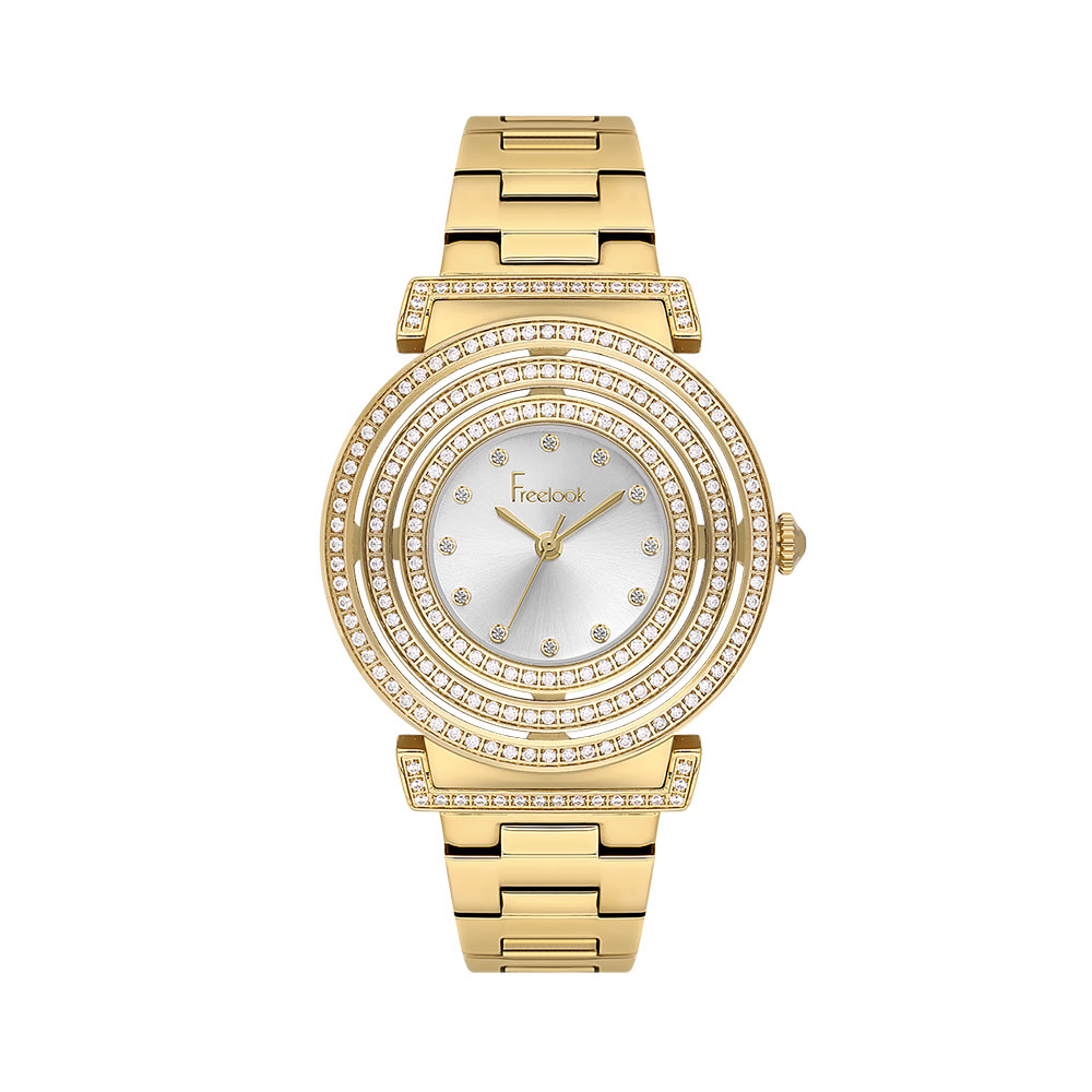 Carcasa rotunda din otel inoxidabil auriu are un diametru de 36 mm si este decorata cu multiple randuri de cristale stralucitoare, oferind un plus de glamour. Cadranul argintiu cu afisaj analogic este pus in valoare de marcajele fine cu cristale, completand un look luxos si modern.