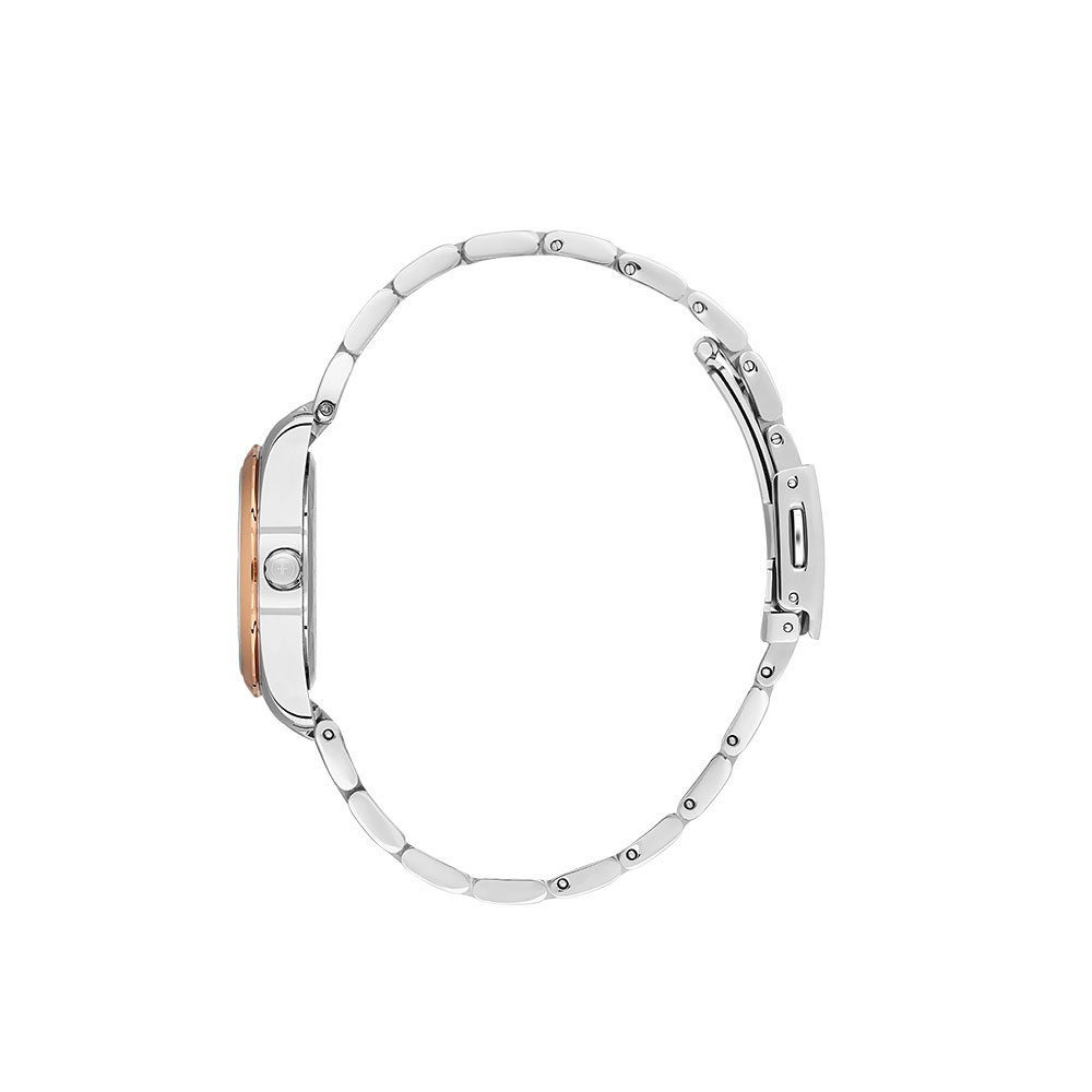 Dotat cu un mecanism quartz japonez Miyota 2035, acest ceas garanteaza o precizie deosebita, avand o abatere de doar ±20 secunde pe luna. Designul sau sofisticat include un cadran argintiu cu detalii subtile si o carcasa din otel inoxidabil, completata de o bratara eleganta care imbina otelul cu nuante de auriu rose, conferind un aspect luxos, dar accesibil.