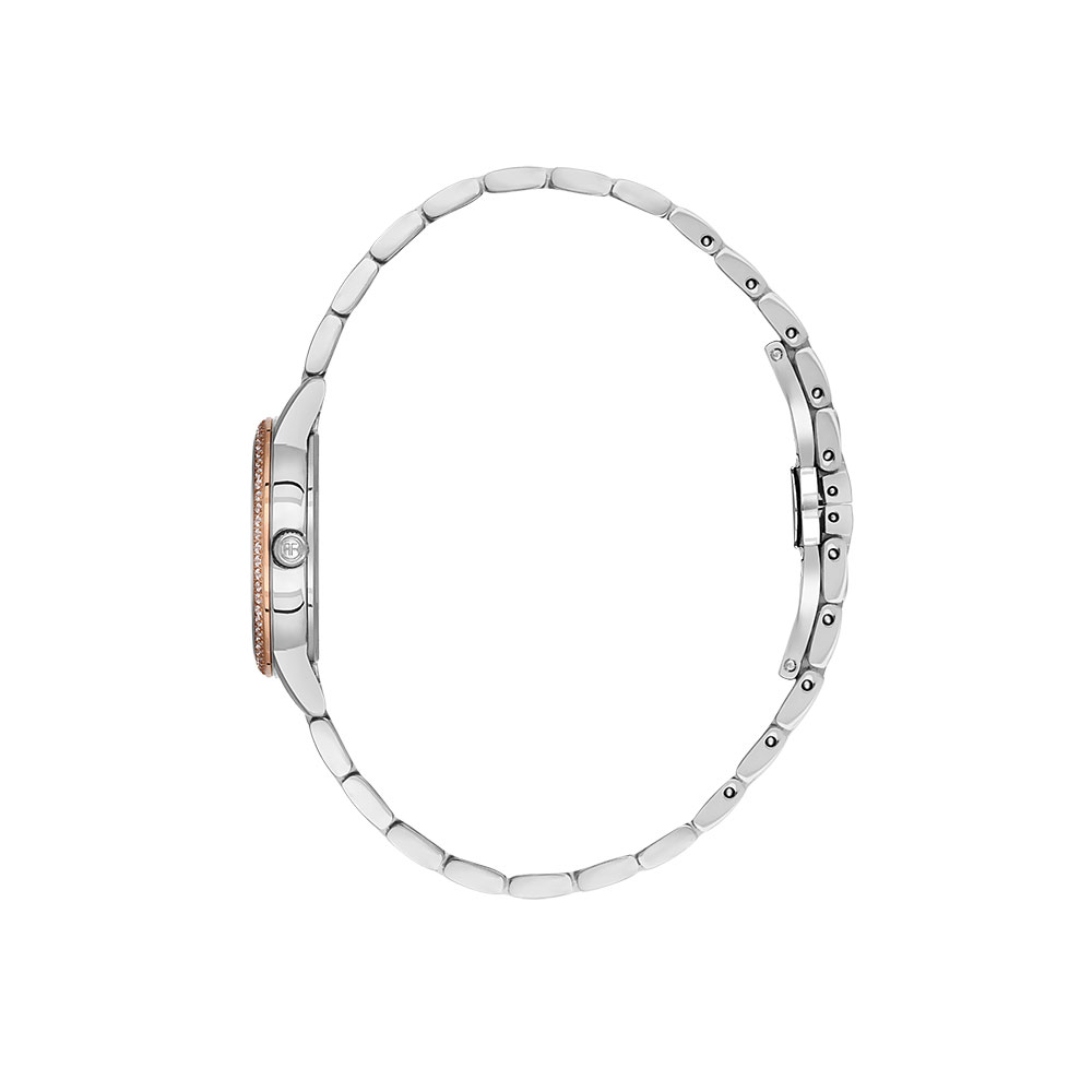 Acest model este dotat cu un mecanism Quartz de la Miyota, recunoscut pentru abaterea minima de ± 20 de secunde pe luna, asigurand acuratete si durabilitate. Cadranul analogic, decorat cu sidef autentic, este incadrat de o carcasa din otel inoxidabil cu detalii argintii si aurii, completata de o bratara din acelasi material, ce se inchide printr-un sistem de tip fluture, usor de manevrat.