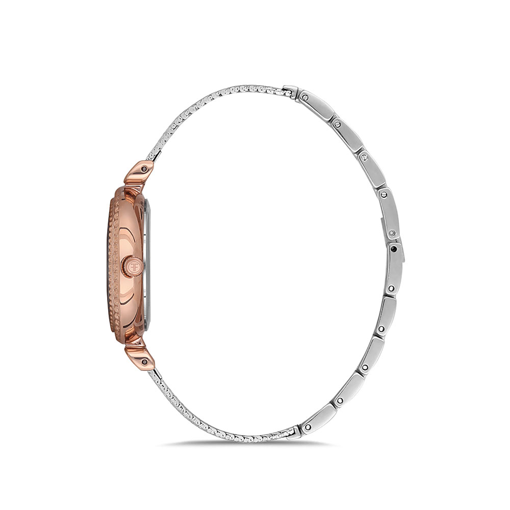 Designul elegant, cu carcasa rotunda din alama in culoarea auriu rose si bratara bicolora impletita, reflecta luxul discret. Detaliile de pe cadran aduc un omagiu subtil frumusetii si complexitatii Turnului Eiffel, simbolul iconic al Parisului.