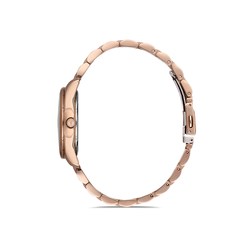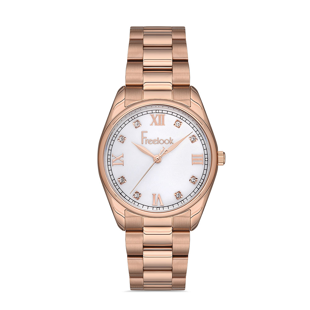 Carcasa rotunda din aliaj metalic, cu o culoare aurie rose, impreuna cu bratara din otel inoxidabil in aceeasi nuanta, confera ceasului un aspect sofisticat si modern. Cadranul alb, decorat cu cifre romane si cristale discrete, reflecta lumina si eleganta, facand din acest ceas alegerea perfecta pentru orice ocazie.
