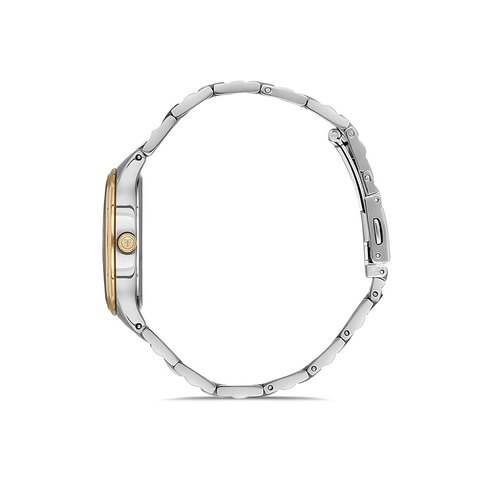 Acest model impresioneaza prin design-ul fashion si detaliile rafinate. Cadranul argintiu, decorat cu cristale, complementat de carcasa din alama si bratara din otel inoxidabil bicolor, transforma orice tinuta intr-una spectaculoasa.