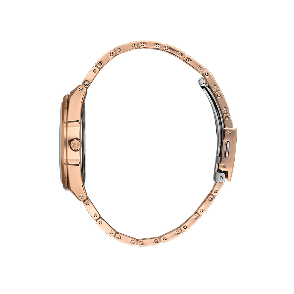 Carcasa din alama cu finisaj in culoare auriu rose si bratara din otel inoxidabil in aceeasi nuanta confera un look sofisticat si versatil. Geamul din cristal mineral rezistent si mecanismul quartz japonez asigura durabilitate si precizie, cu o abatere de doar ±20 secunde pe luna.