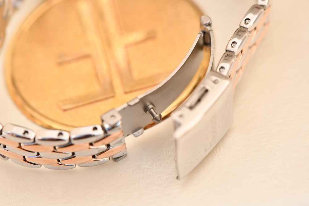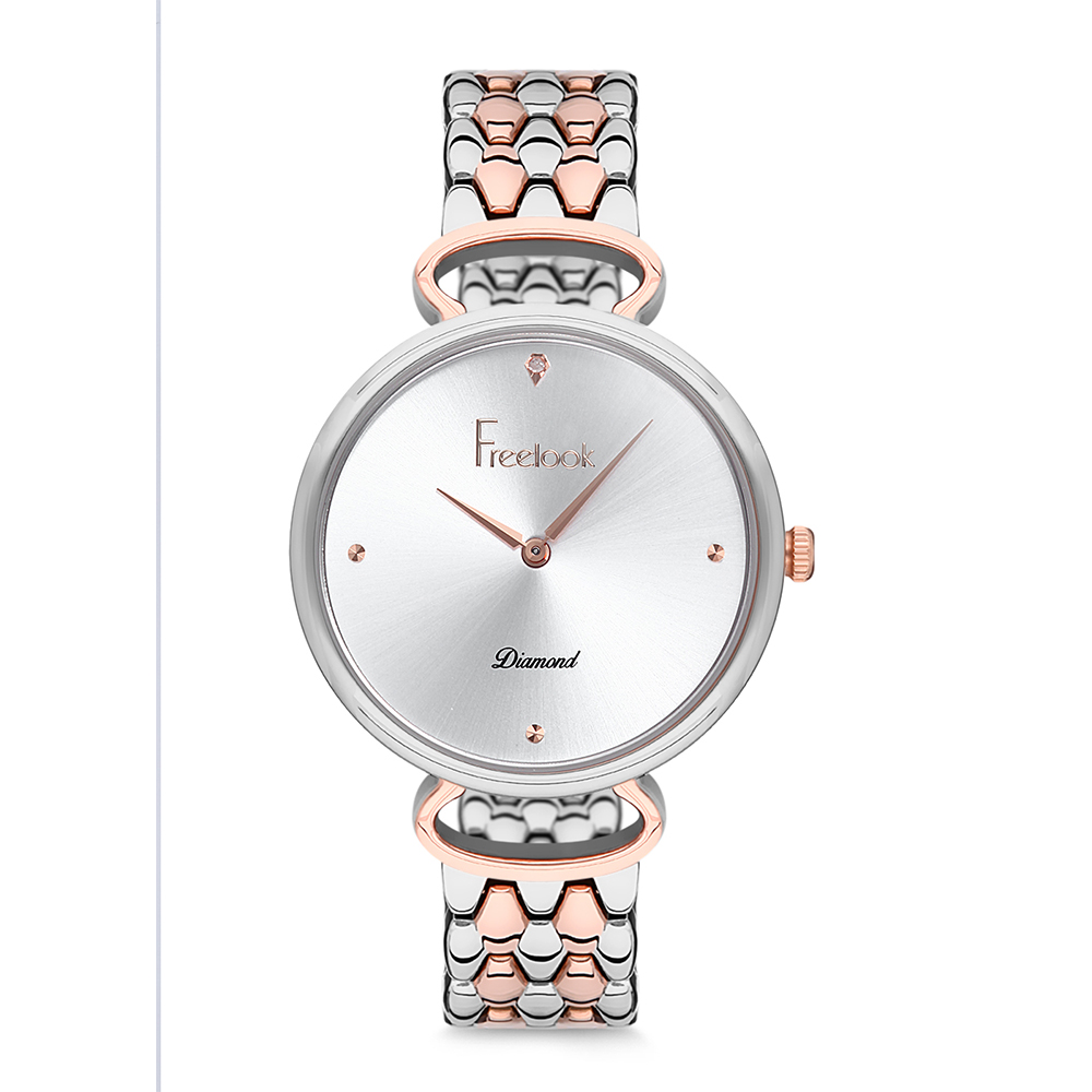 Cu un design sofisticat, ceasul prezinta o carcasa rotunda din otel inoxidabil, finisata in nuante de argintiu, completata de o bratara bicolora care adauga un contrast subtil si atragator. Cadranul argintiu este accentuat de indicii in culoare auriu rose, creand o imagine de rafinament.
