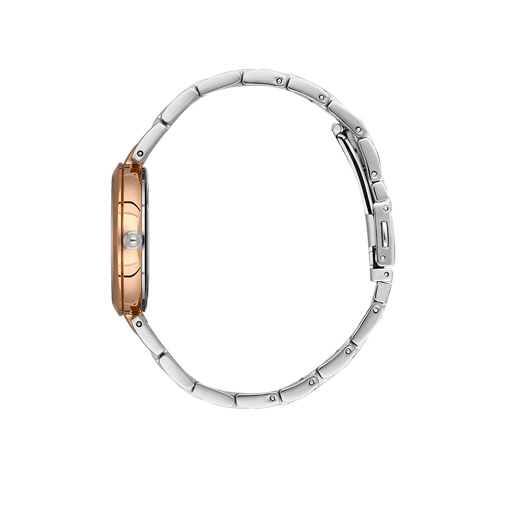 Carcasa rotunda din alama, finisata in nuante de auriu rose, impreuna cu bratara din otel inoxidabil in acelasi ton, confera ceasului un aspect luxos, perfect pentru orice ocazie. De la intalniri de afaceri pana la evenimente sociale, ceasul Freelook Jolie este alegerea ideala pentru a adauga o nota de sofisticare tinutei tale.