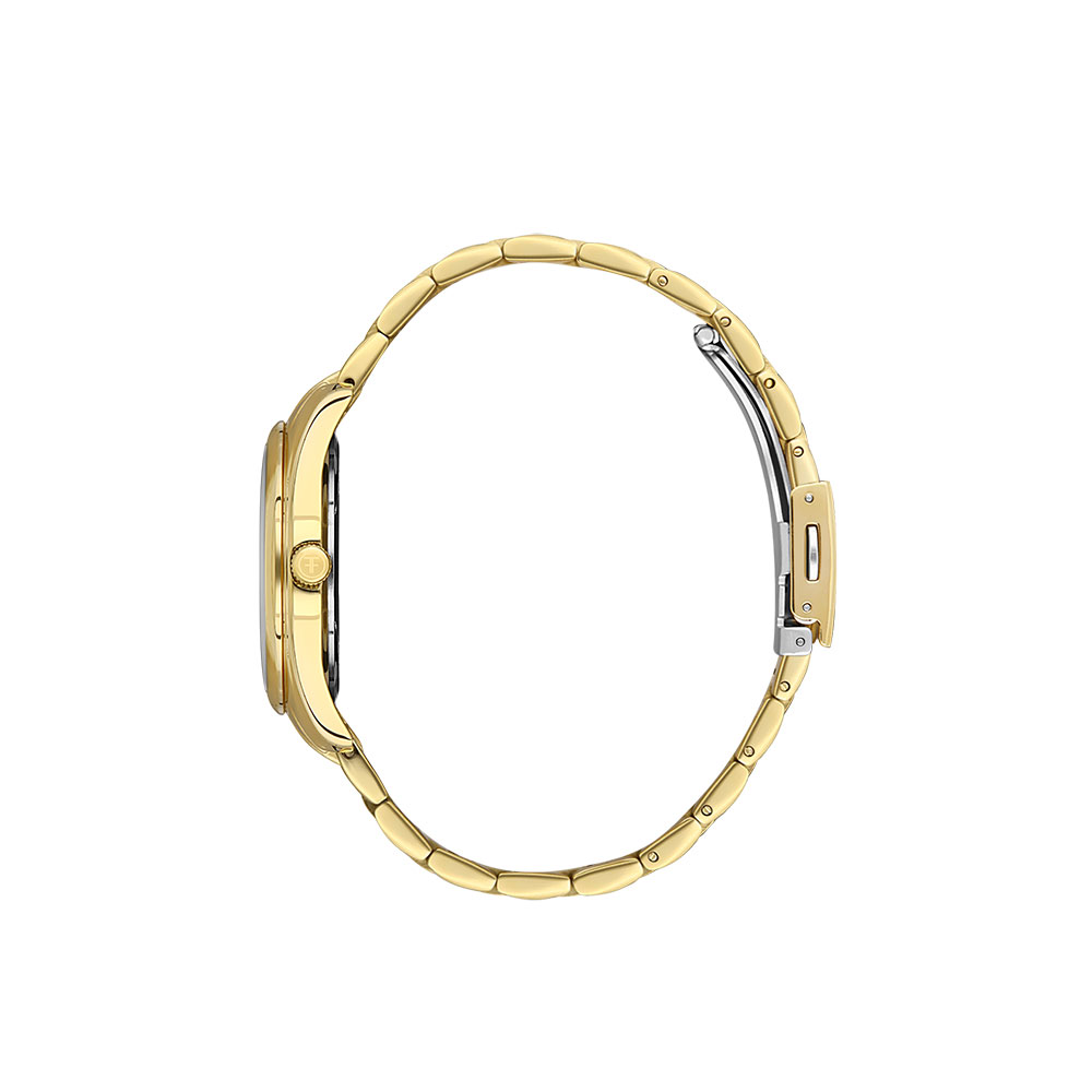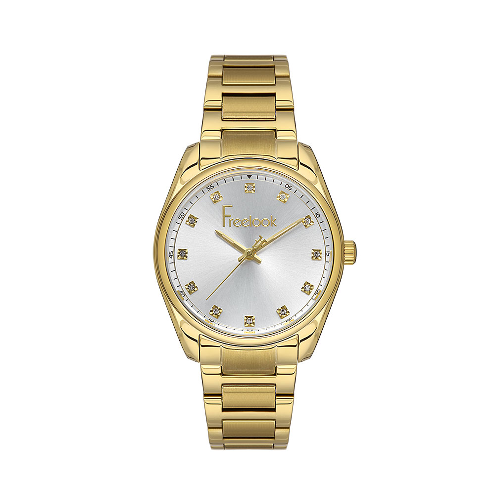 Carcasa rotunda de 35 mm din alama auriu si bratara din otel inoxidabil subliniaza o estetica rafinata si durabila. Cadranul argintiu, accentuat de cristale minerale si detalii aurii, adauga un strop de stralucire oricarei tinute, facand din Ceasul Freelook Jolie alegerea ideala pentru orice moment al zilei.