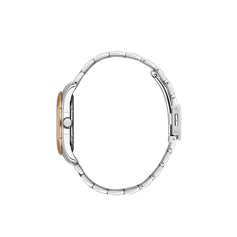Rezistenta la apa de 5 atm il face perfect pentru utilizare zilnica, fie ca esti la birou sau in deplasari. Bratara din otel inoxidabil, cu detalii argintii si aurii, ofera confort si durabilitate, in timp ce sistemul de inchidere tip fluture asigura o fixare sigura si eleganta.