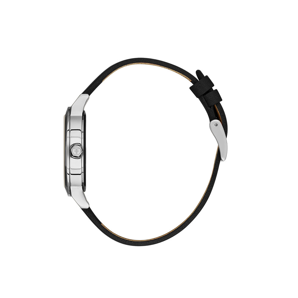 Forma rotunda a carcasei de 34 mm, realizata din alama de culoare argintie, completeaza perfect cureaua de piele neagra, oferind un contrast elegant si versatil. Rezistenta la apa de pana la 5 atm face din acest ceas un companion de incredere in orice conditii meteo.