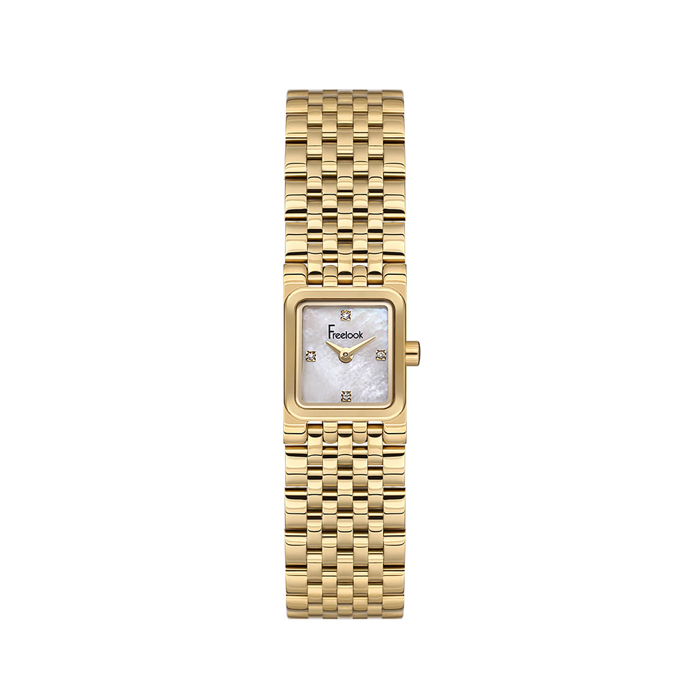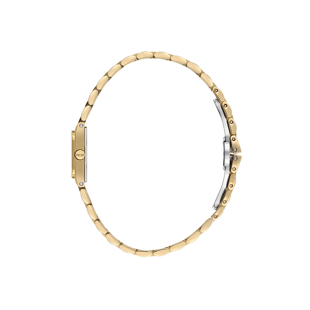 Realizat din otel inoxidabil de culoare aurie, atat pentru carcasa, cat si pentru bratara cu sistem de inchidere tip fluture, acest model se remarca prin finisajele lucioase si durabilitatea materialelor. Cadranul argintiu cu efect sidefat este protejat de un cristal mineral rezistent la zgarieturi si este decorat cu patru cristale stralucitoare, marcand orele principale pentru un plus de stil si vizibilitate.