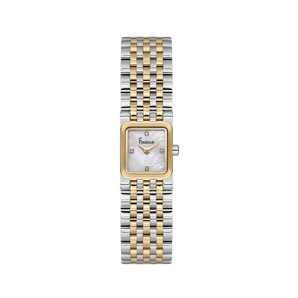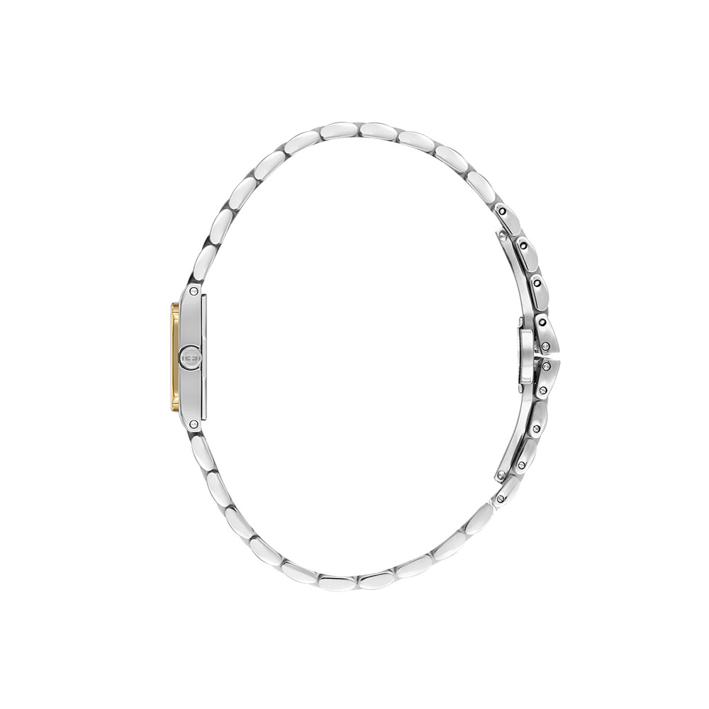 Carcasa din otel inoxidabil in nuanta aurie este completata armonios de o bratara bicolora, realizata din otel inoxidabil auriu si argintiu, cu sistem de inchidere tip fluture pentru confort si siguranta la purtare. Cadranul alb sidefat este accentuat de marcaje discrete cu cristale, oferind un plus de stralucire si stil.