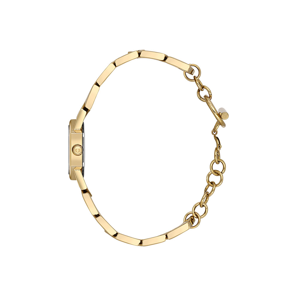 Carcasa si bratara din otel inoxidabil auriu confera ceasului un aspect sofisticat si durabilitate in timp. Cadranul negru intens cu afisaj analogic minimalist evidentiaza perfect contrastul cromatic si adauga un plus de eleganta.