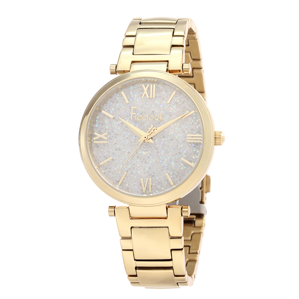 Cadran decorat cu pudra de zirconii; bratara tip zale, cu inchizatoare tip fluture.
