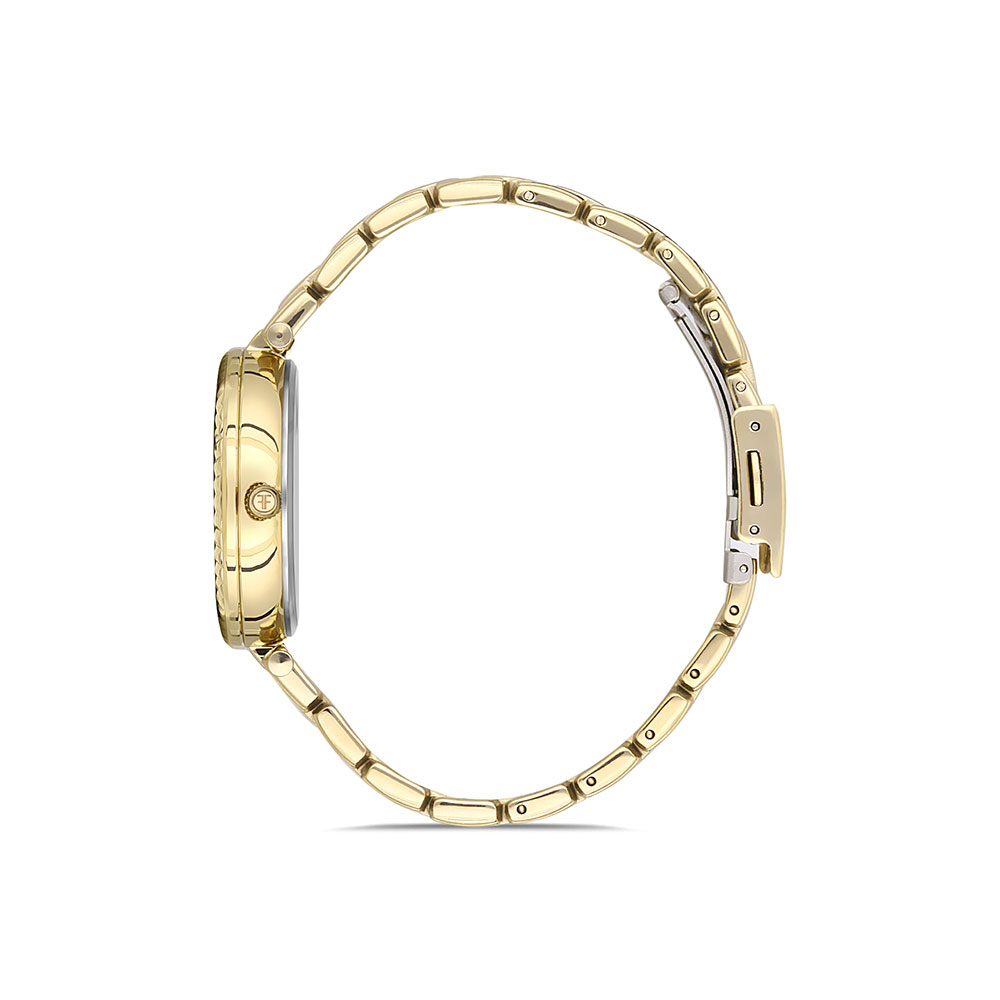 Ceasul este echipat cu un mecanism quartz japonez de inalta precizie, garantand o abatere minima de ±20 secunde pe luna. Afisajul analogic, impreuna cu geamul din cristal mineral, ofera o claritate impecabila si rezistenta sporita. Cadranul alb argintiu, accentuat de detalii aurii, confera o nota de lux si versatilitate, facandu-l usor de asortat cu diverse tinute, de la cele casual la cele formale.