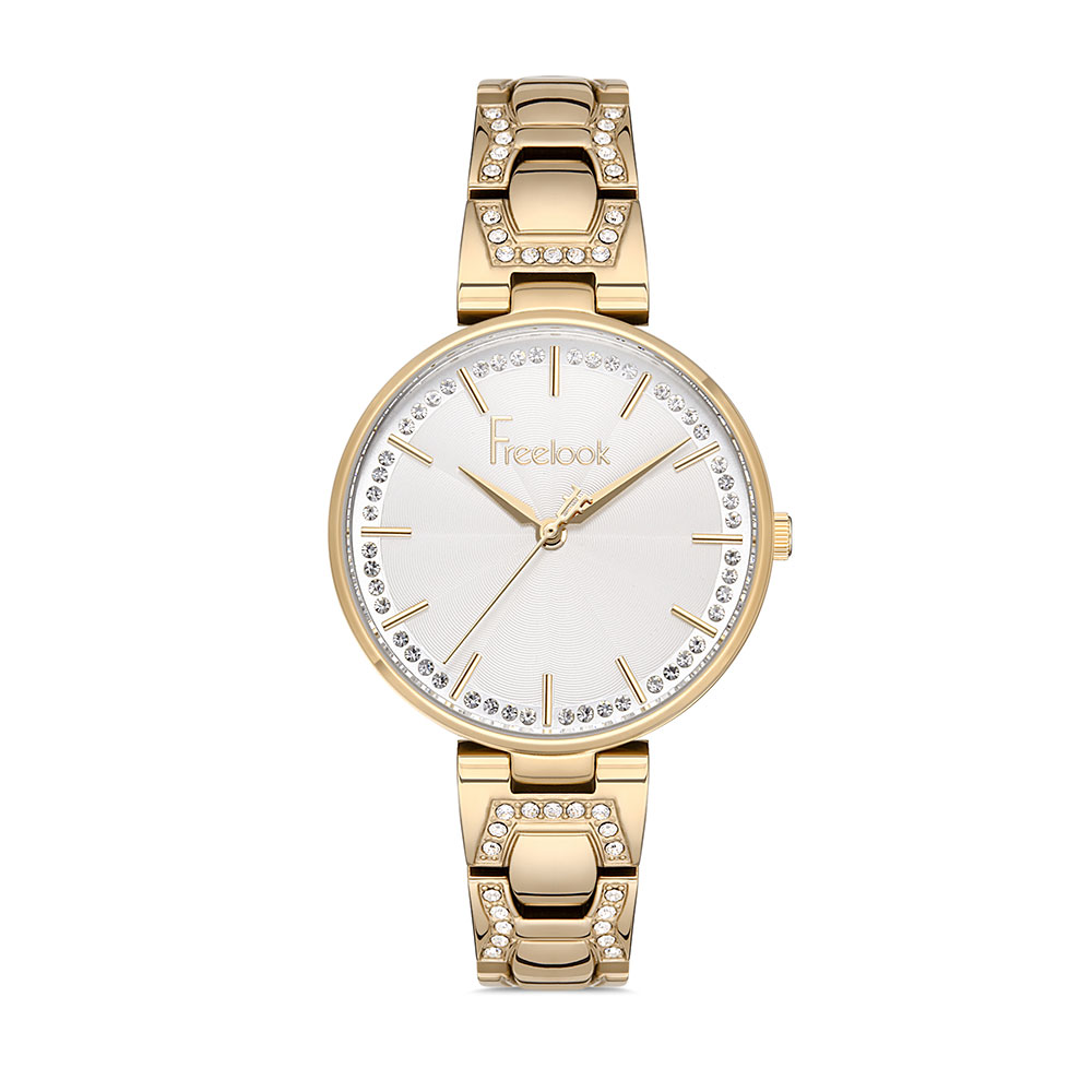 Cadran decorat cu zirconii albe; bratara tip zale, decorata cu zirconii albe, avand inchizatoare tip fluture.