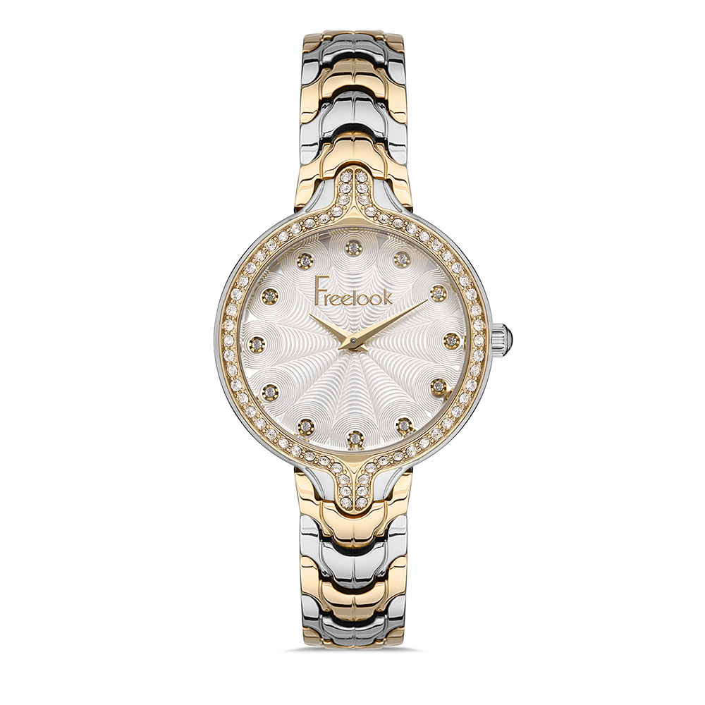 Cadran decorat cu zirconii albe; carcasa argintie, cu bezel decorativ auriu si zirconii albe; bratara tip zale, in doua culori, argintiu si auriu, cu inchizatoare tip fluture; fara indicator secunde.