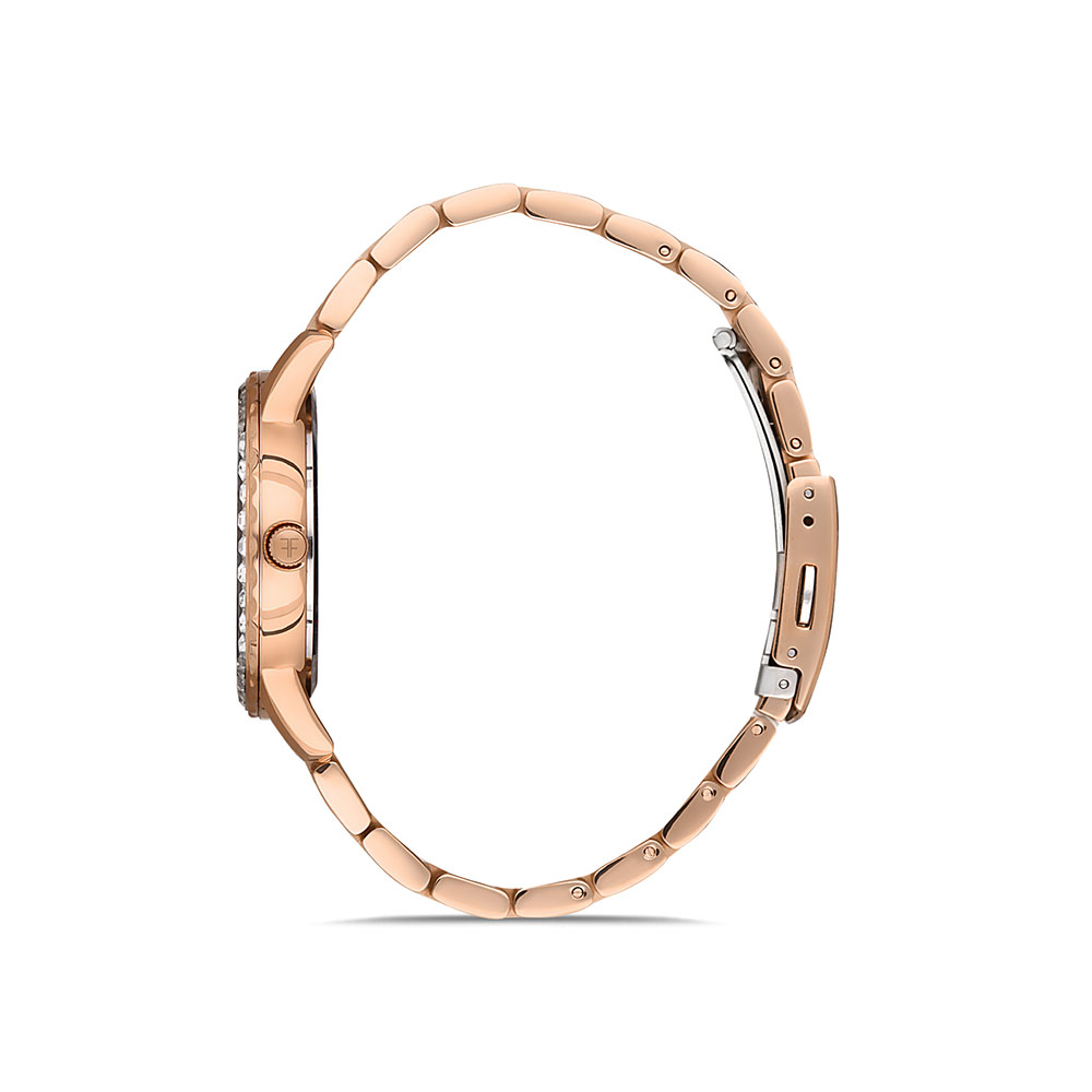 Realizat cu o carcasa din alama de culoare auriu rose si incrustat cu cristale stralucitoare, ceasul prezinta un cadran argintiu care reflecta lumina naturala, creand un efect vizual impresionant. Bratara din otel inoxidabil in ton cu carcasa confera un aspect coeziv si durabil. Mecanismul de tip Quartz cu provenienta japoneza asigura o precizie de neegalat, avand o abatere de doar ±20 secunde pe luna, iar rezistenta la apa de 5 atm il face ideal pentru uz cotidian.