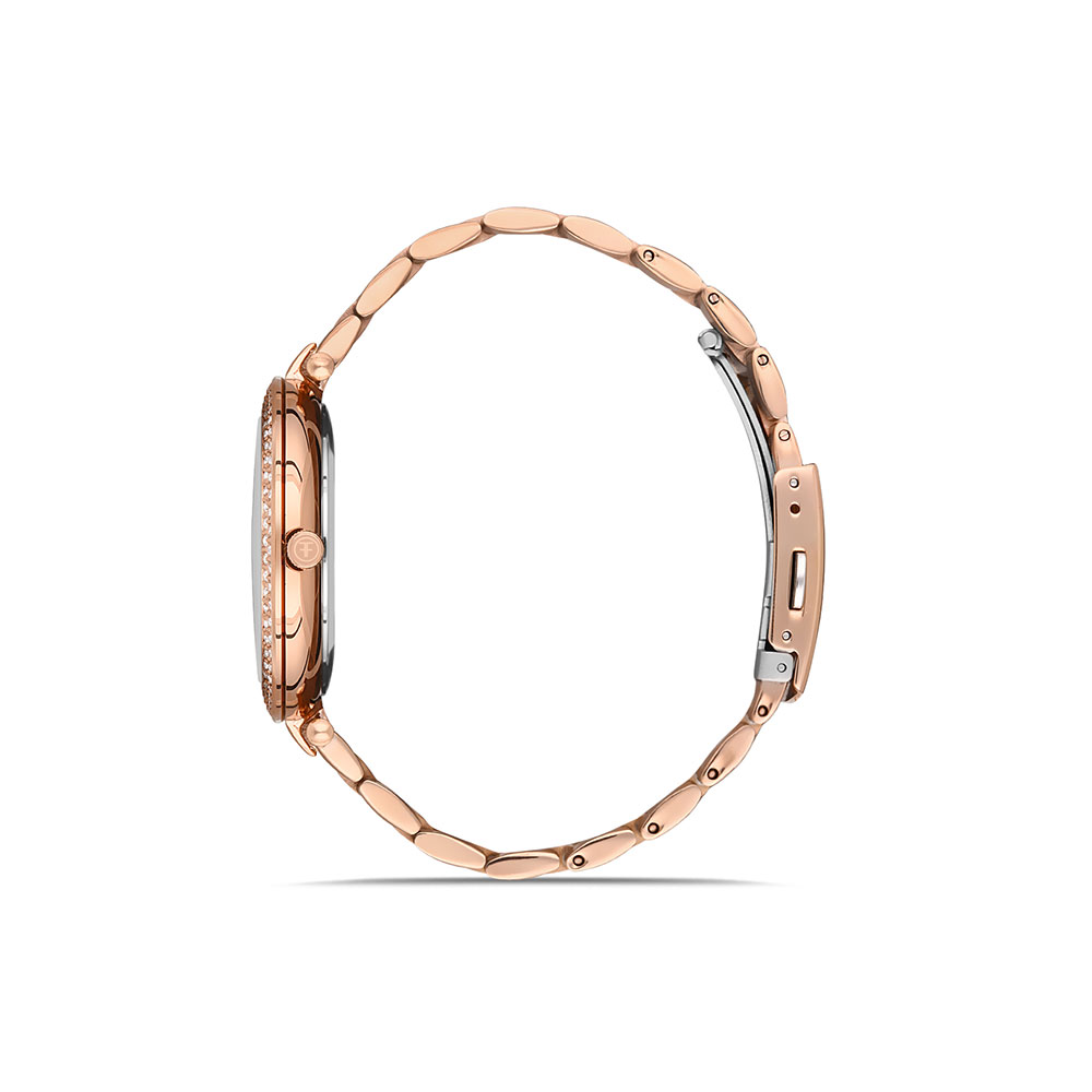 Bratara din otel inoxidabil in culoarea aurului rose se inchide printr-un sistem de inchidere fluture, oferind un confort superior si o siguranta in utilizare. Rezistenta la apa de pana la 5 atm face acest ceas ideal pentru uz zilnic, protejandu-l impotriva apei in timpul activitatilor obisnuite.