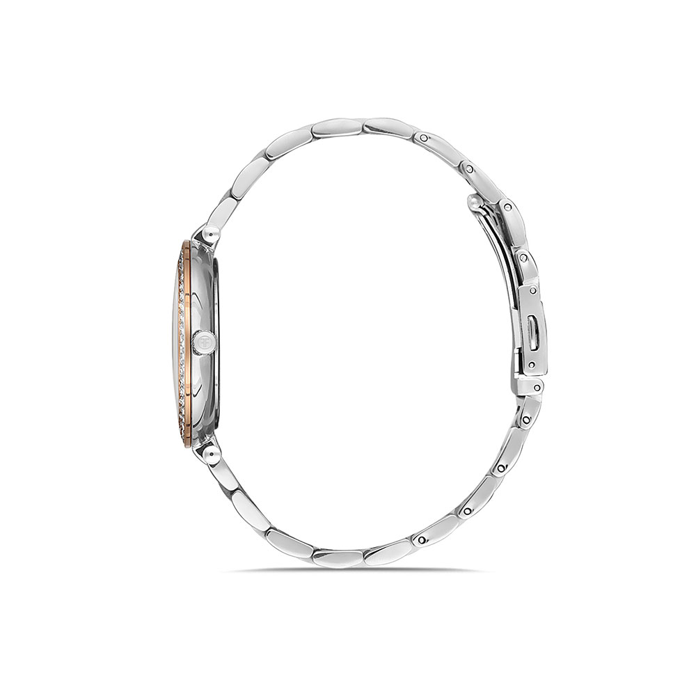 Acest model impresioneaza prin mecanismul Quartz de inalta precizie, provenit din Japonia, garantand o abatere minima de ±20 secunde pe luna. Cadranul argintiu este accentuat de cristale stralucitoare, setate meticulos pentru a reflecta fiecare raza de lumina. Bratara bicolora din otel inoxidabil asigura durabilitate si confort, in timp ce sistemul de inchidere tip fluture ofera securitate si usurinta in utilizare.